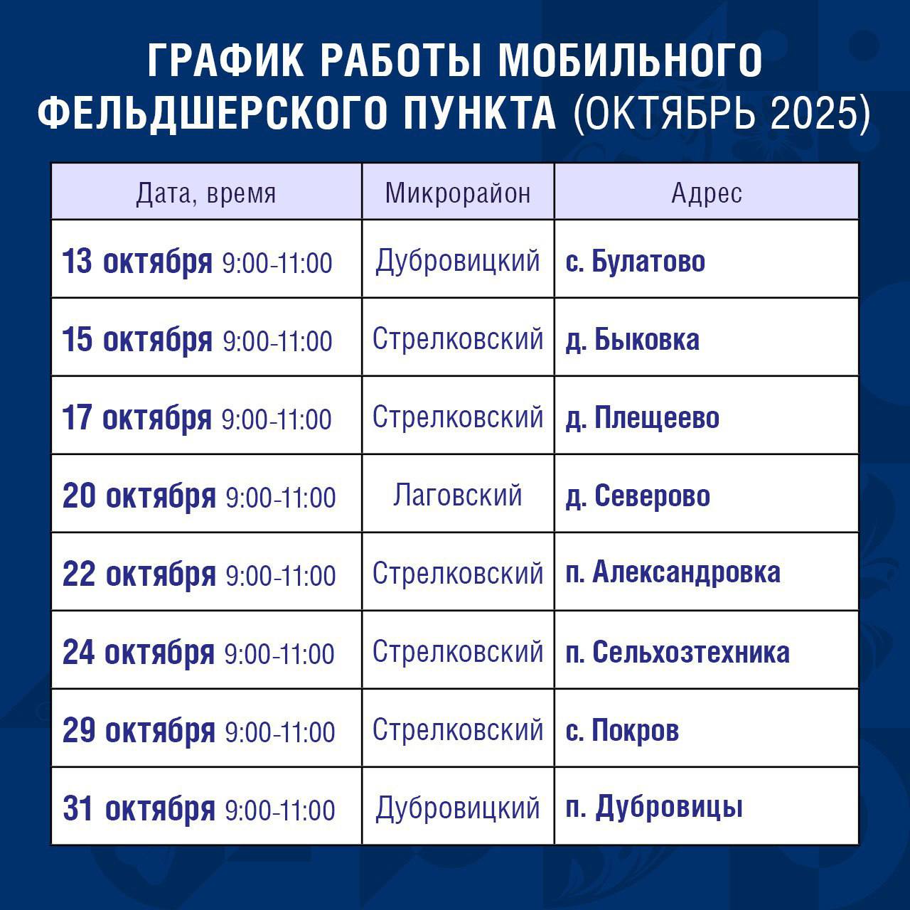 В октябре жители Подольска могут проверить свое здоровье не только в поликлинике, но и рядом с домом. С 09:00 до 11:00 будут работать мобильные бригады ПОКБ.