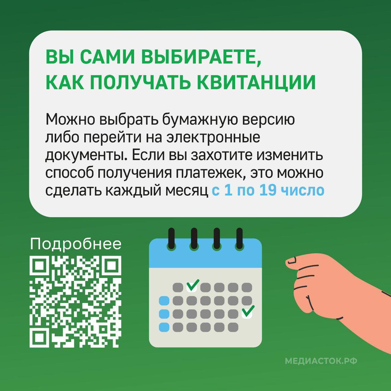 Изменить способ получения платёжек с электронных документов на бумажную версию или наоборот можно каждый месяц с 1 по 19 число.