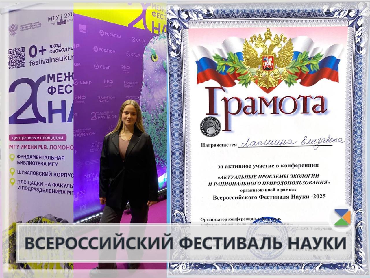 11 октября ученица 8б класса нашей школы Лапшина Елизавета приняла участие в конференции «Актуальные проблемы экологии и рационального природопользования», которая проходила на биологическом факультете МГУ в рамках Всероссийского Фестиваля Науки - 2025.