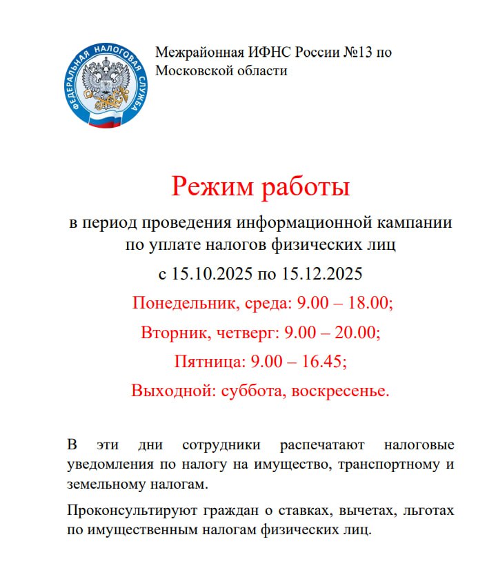 С 15 октября по 15 декабря Межрайонная ИФНС России №13 по Московской области ведёт приём по следующему графику:Понедельник, среда: 9:00 - 18:00;
