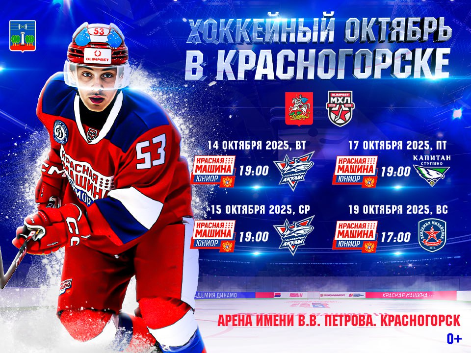 В Красногорске продолжается сезон Молодёжной хоккейной лиги, и с 14 октября команда «Академия Динамо «Красная Машина Юниор» начнёт серию домашних матчей на Арене имени В.В. Петрова.