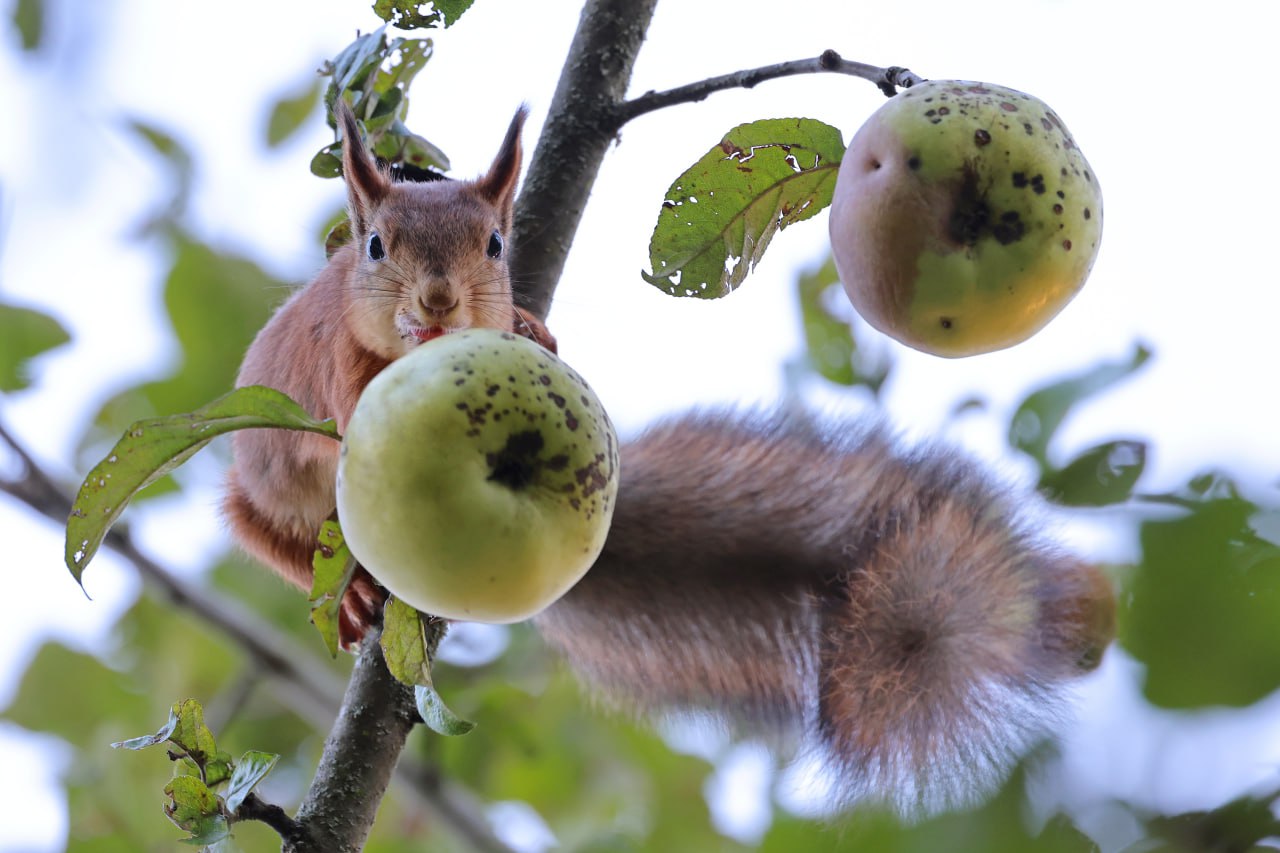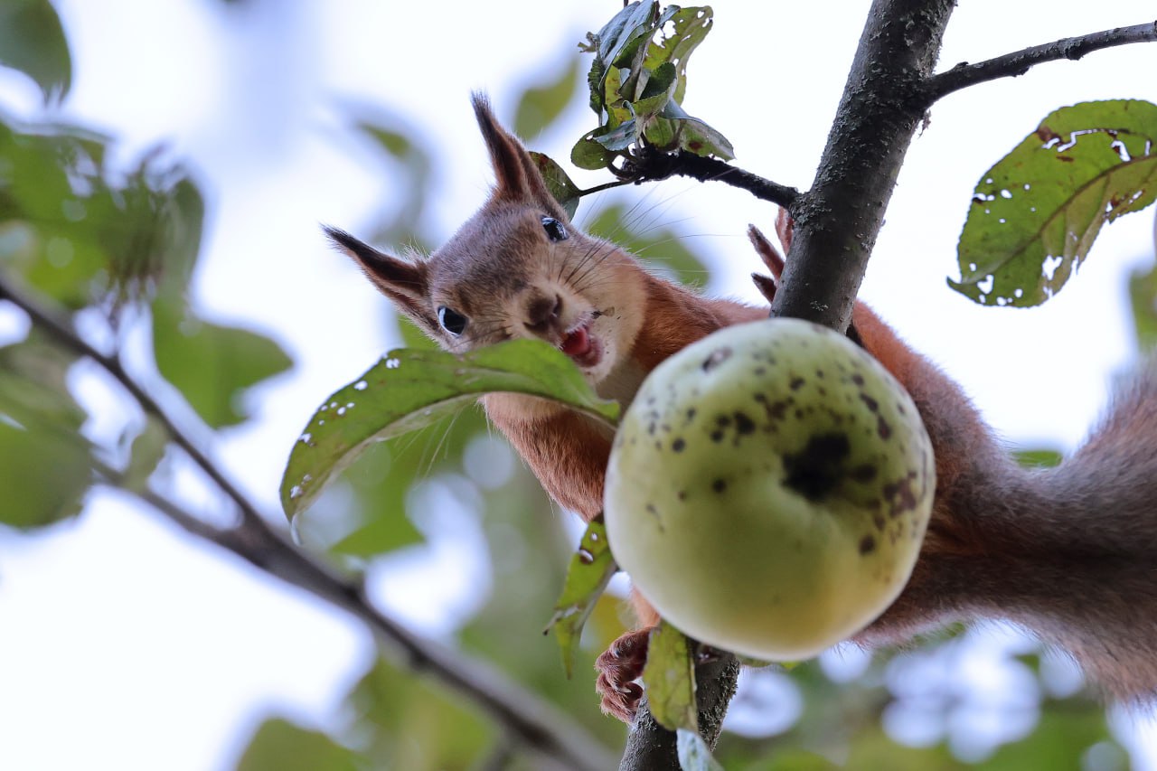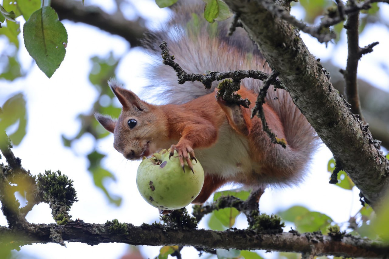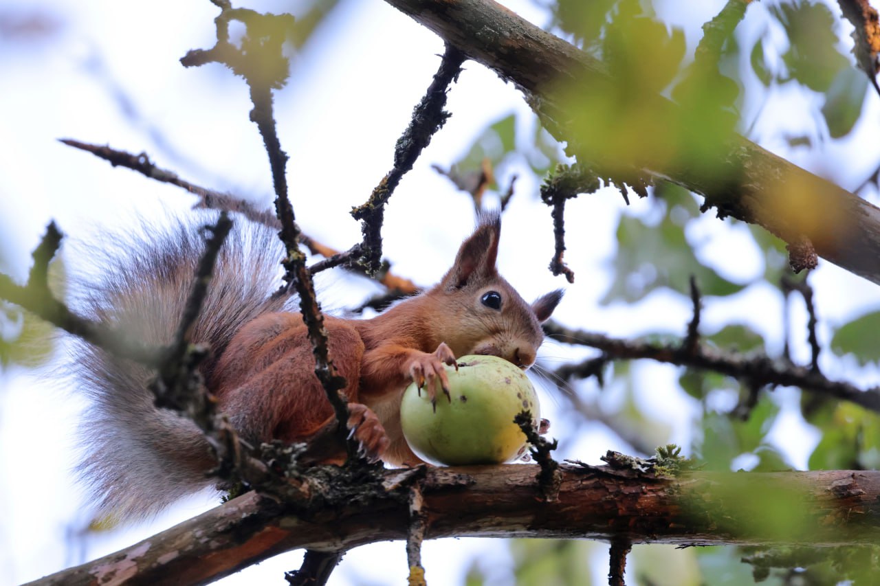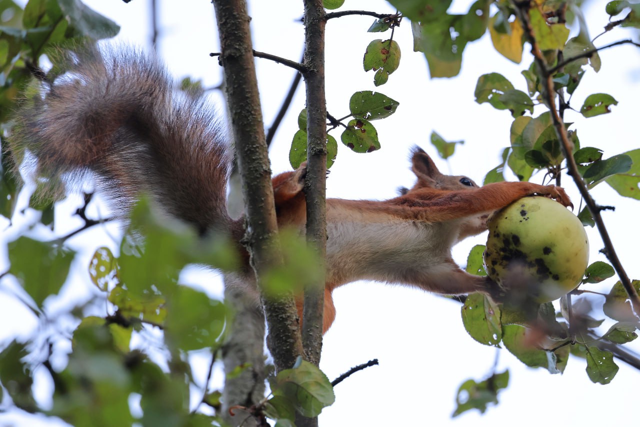 Мелиховская белочка, которую с подачи нашего фотографа музейные дети (дети и внуки сотрудников музея) назвали Беллой, устроила настоящий забег по веткам... с яблоком.