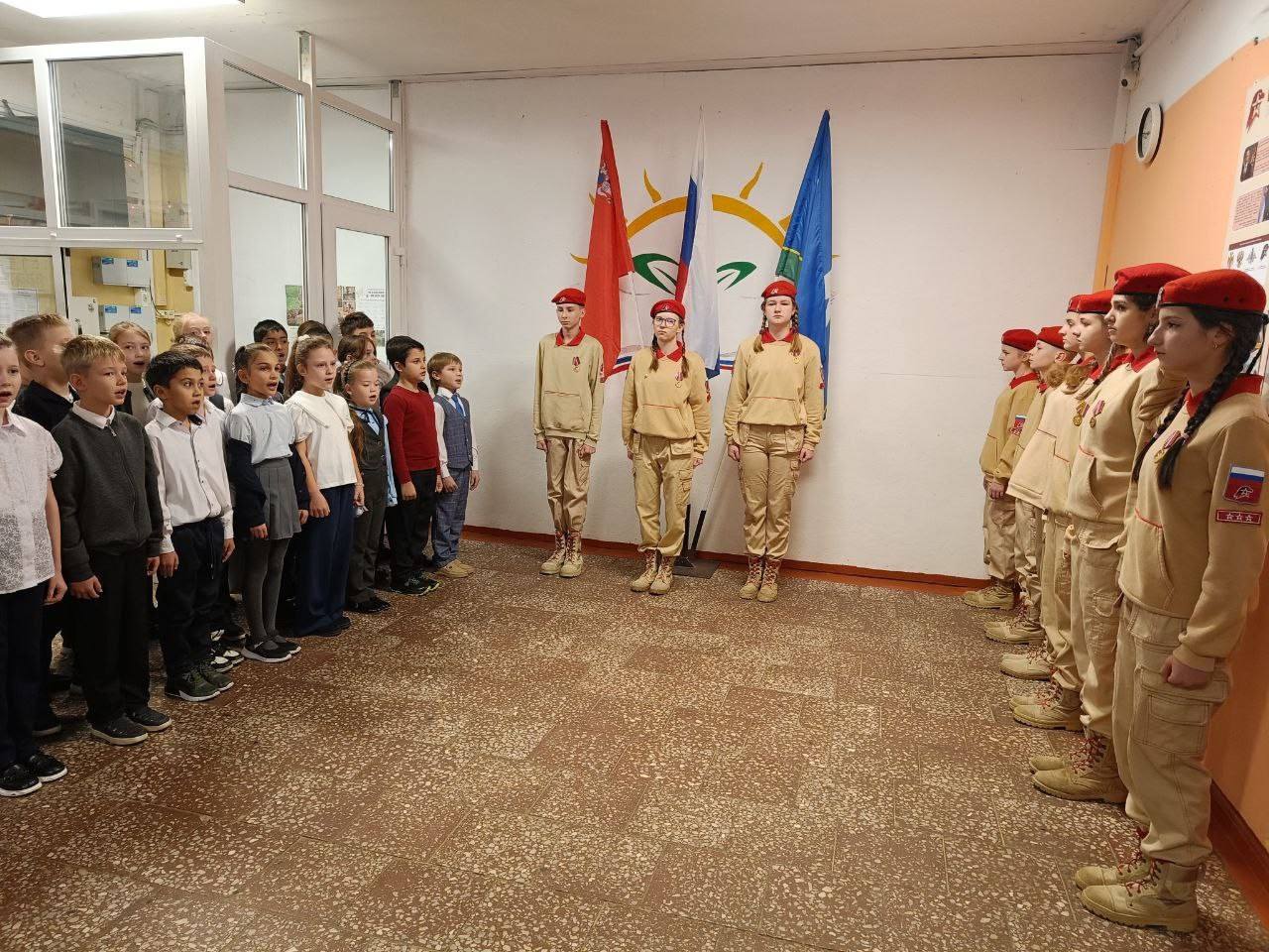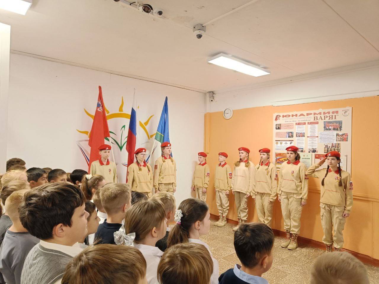 Учебная неделя началась по традиции с церемонии выноса государственного флаги и исполнения государственного гимна. Почетное право выноса флага предоставлено ученице 8д класса юнармейцу Гайдук Полине.