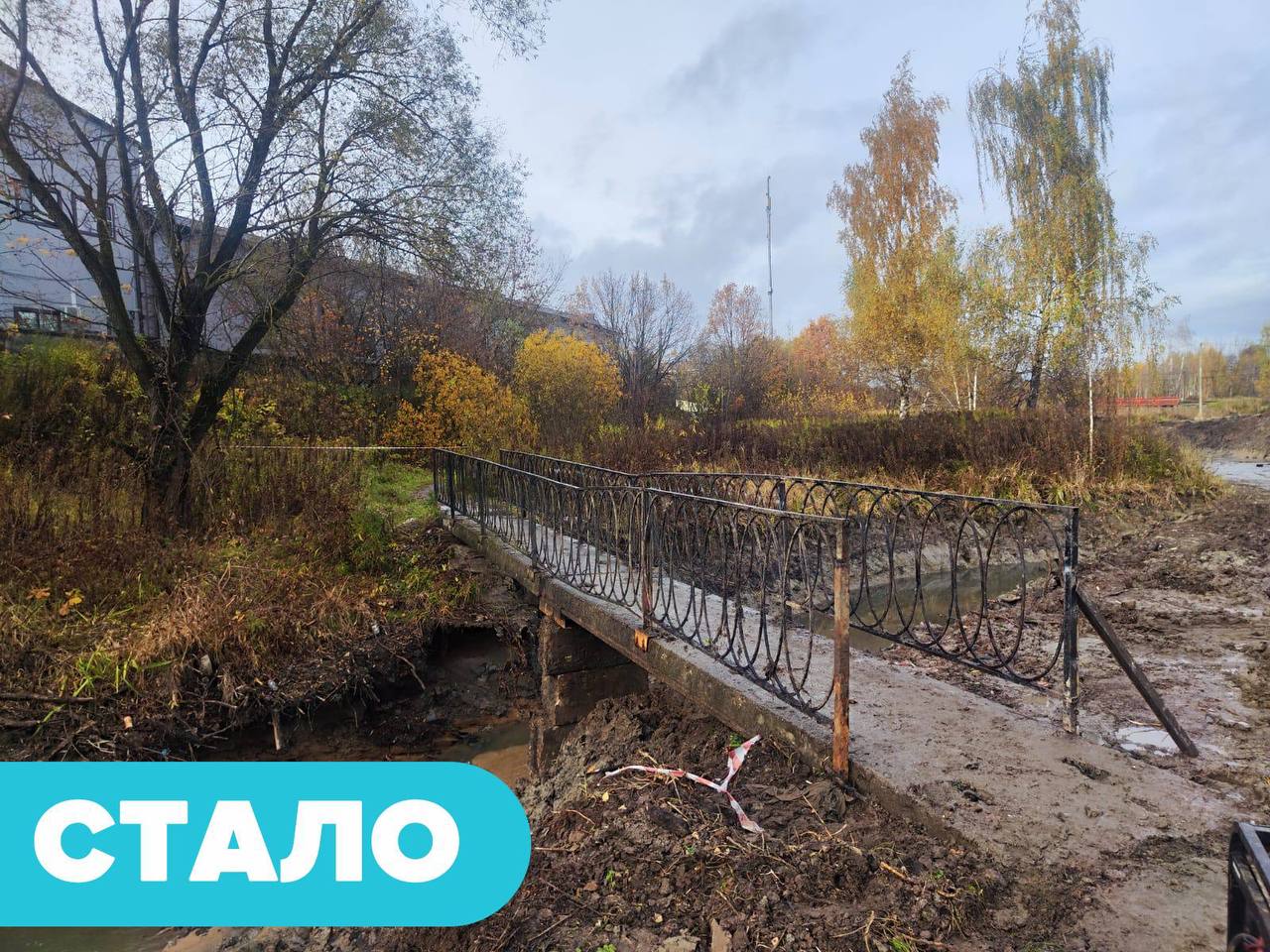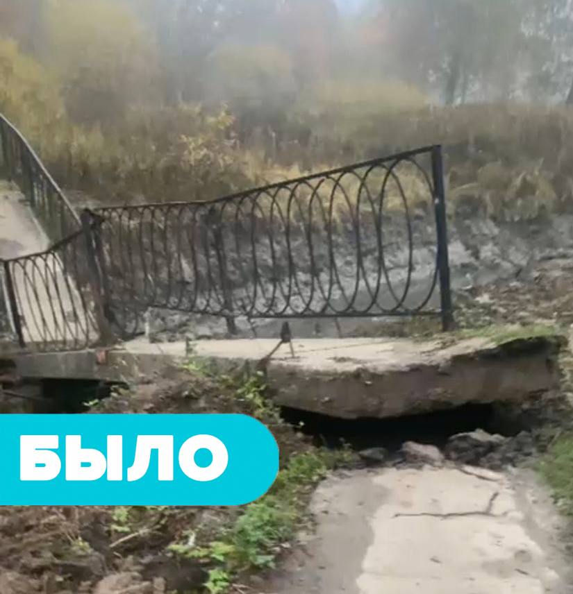 Подрядная организация вышла на работы. Опору моста подняли, перила восстановили – сегодня работы завершены.