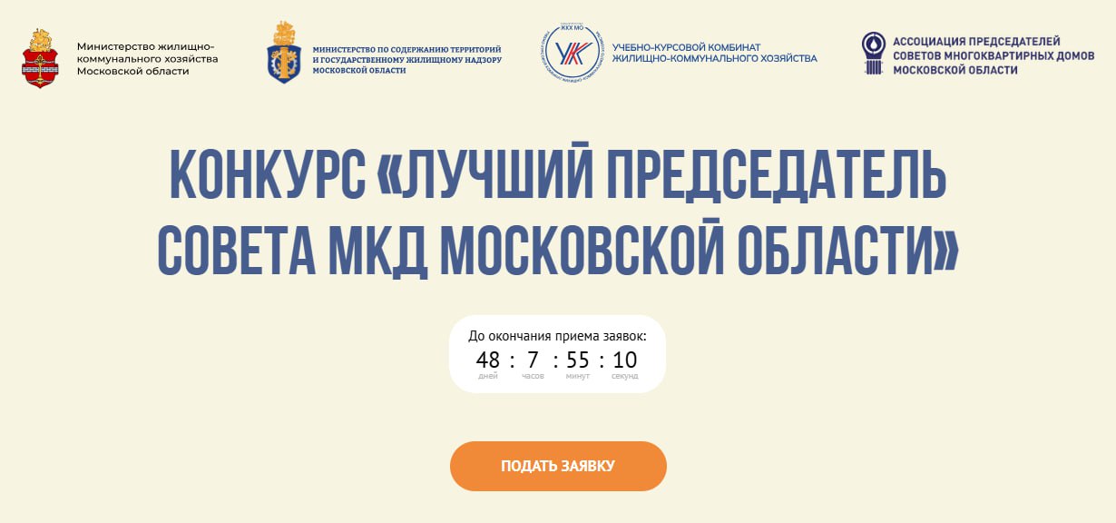 Стартовал прием заявок на смотр-конкурс «Лучший председатель Совета МКД Московской области». В 2025 году мероприятие проводится уже в шестой раз. Принять участие в нем могут действующие председатели Советов многоквартирных домов, проживающие в Московской области.