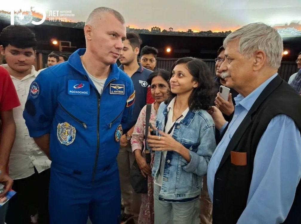 А в Мумбаи Денис Матвеев вместе с начальником отдела координации международной деятельности Центра подготовки космонавтов Игорем Корешевым встретились с ректором университета Мумбаи профессором Равиндрой Д. Кулкарни и студентами вуза. Поговорили о вопросах психологической и физической подготовки к длительным полетам и навыков, необходимых для пребывания в космосе.
