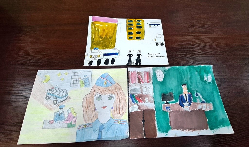 Юные художники представили свои творческие работы, в которых постарались передать, как видят службу мам и пап, ежедневно обеспечивающих правопорядок и безопасность в их родном городе.