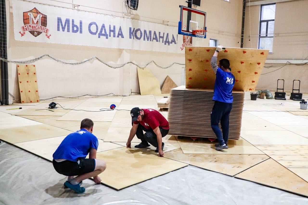 На сегодняшний день ведется укладка пароизоляционной пленки и двойного слоя фанеры со специальными резиновыми амортизаторами. Такое профессиональное покрытие уменьшит нагрузку на коленные суставы спортсменов и снизит травмоопасность.