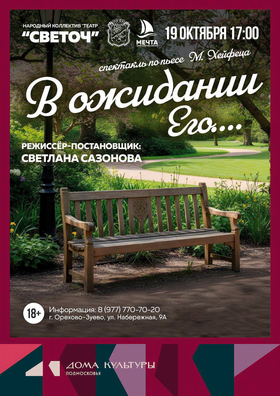 19 октября в 17:00 Народный коллектив «Театр «Светоч» представит спектакль «В ожидании Его» по пьесе Михаила Хейфеца, режиссёр Сазонова С.М.