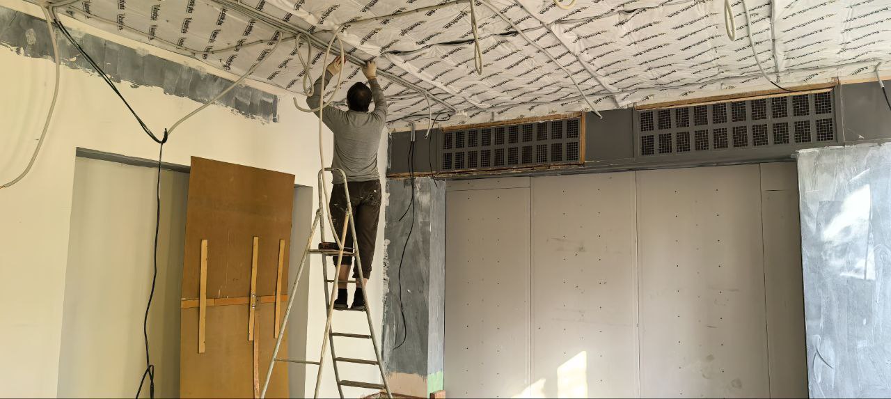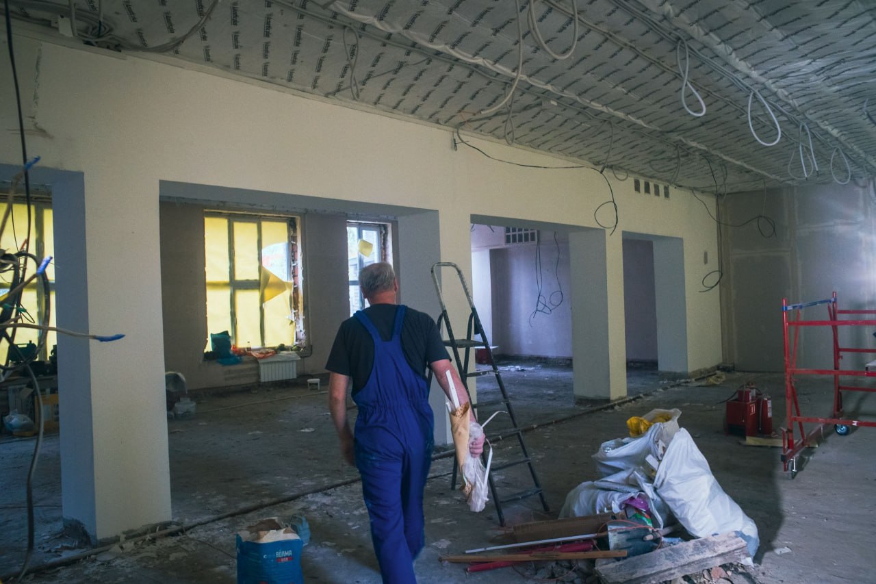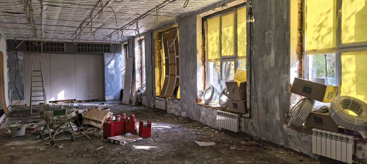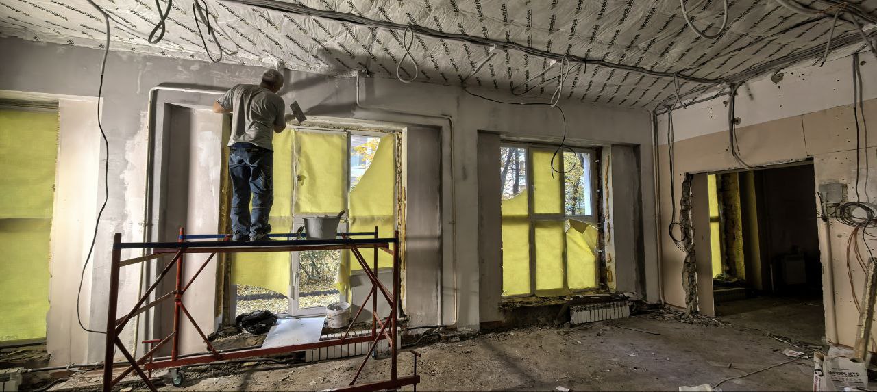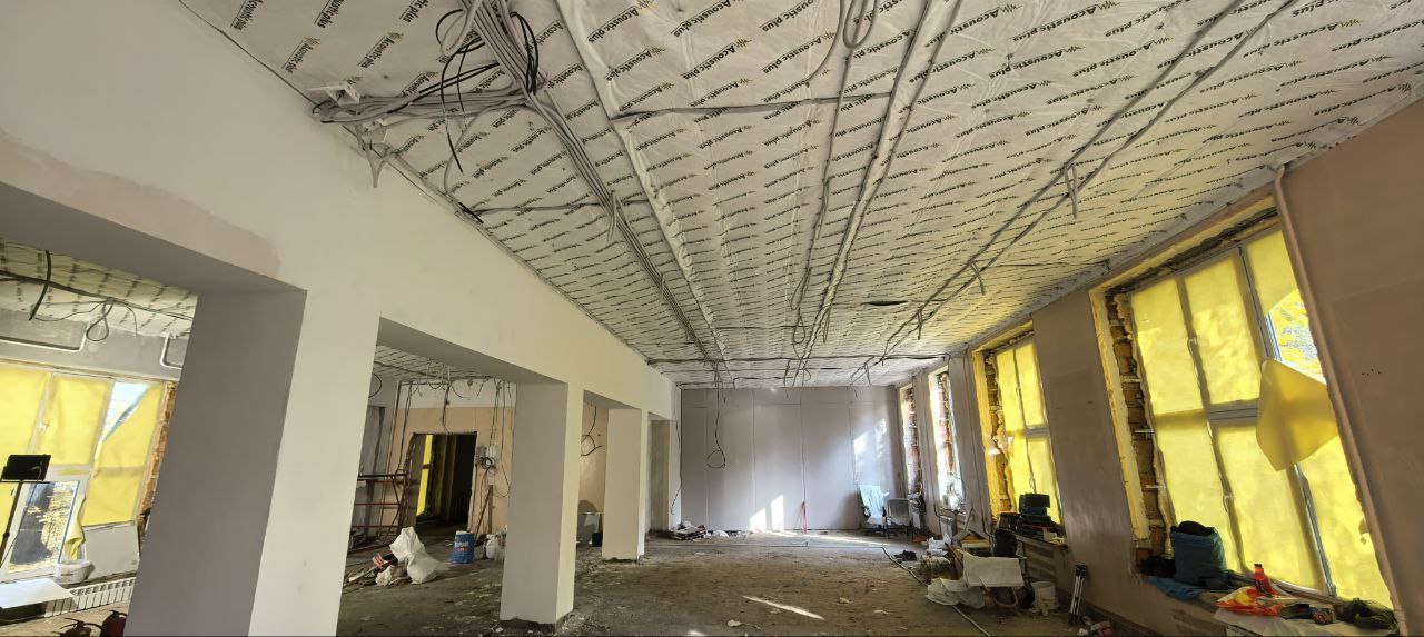 В библиотеке на 100% завершены работы по замене радиаторов, прокладке звукоизоляции, черновой прокладке слаботочных и силовых кабелей. В настоящее время специалисты начали шпатлевать, заделывать трещины, обшивать гипсокартоном стены.