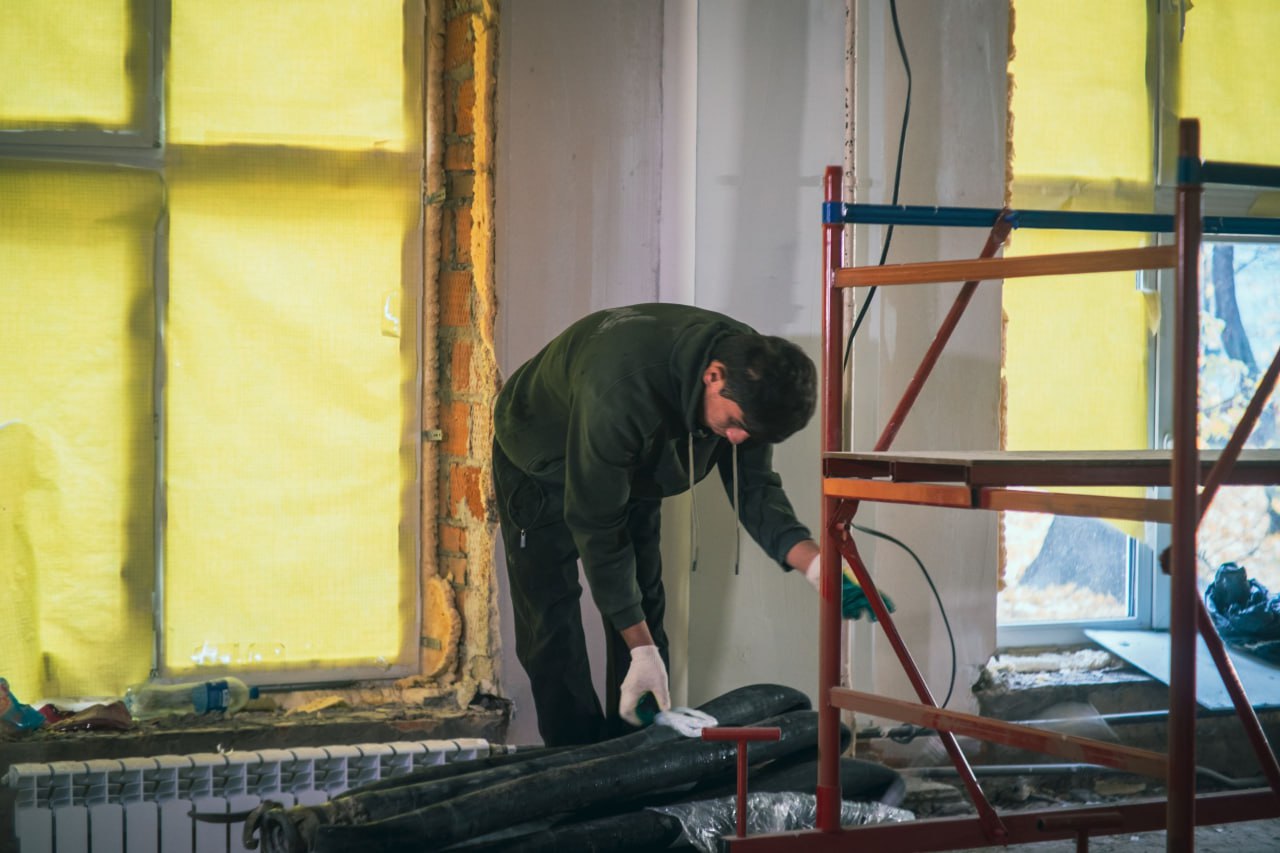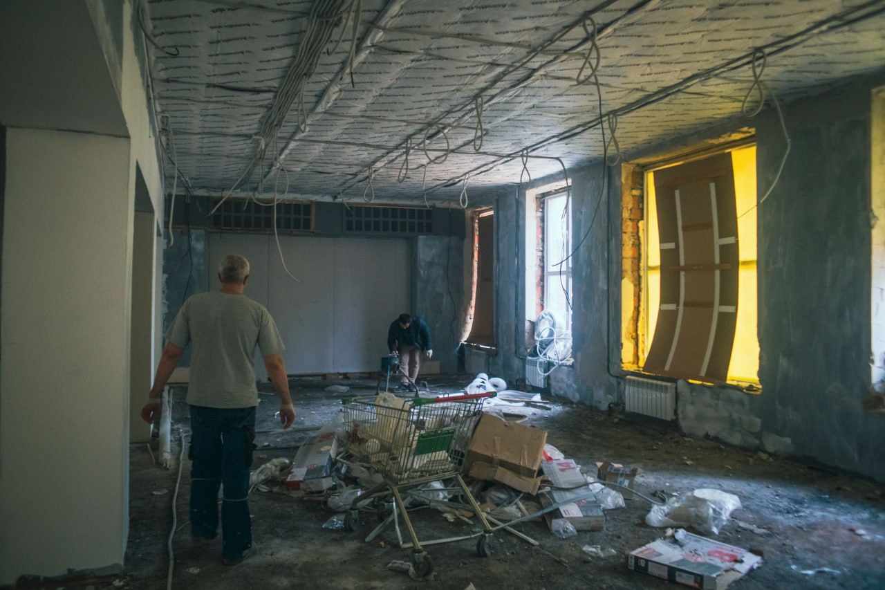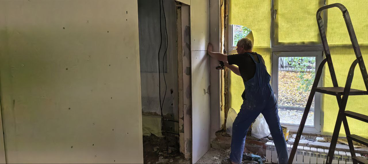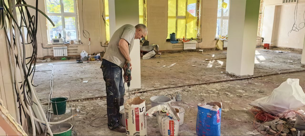 В библиотеке на 100% завершены работы по замене радиаторов, прокладке звукоизоляции, черновой прокладке слаботочных и силовых кабелей. В настоящее время специалисты начали шпатлевать, заделывать трещины, обшивать гипсокартоном стены.