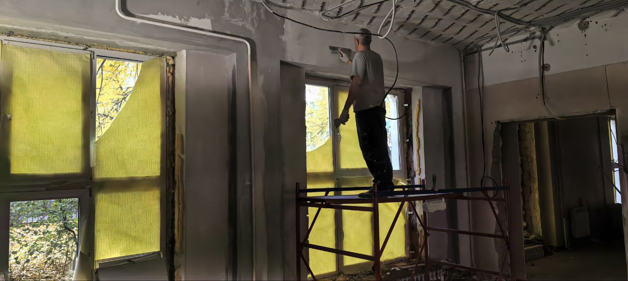 Продолжаются работы по капремонту Центральной библиотеки им. С. Есенина. В настоящее время на объекте производится черновая отделка стен.