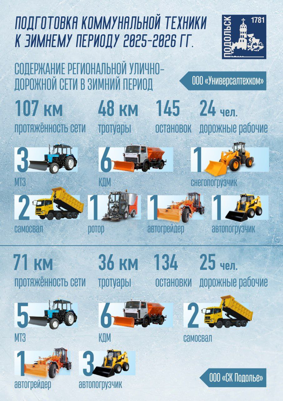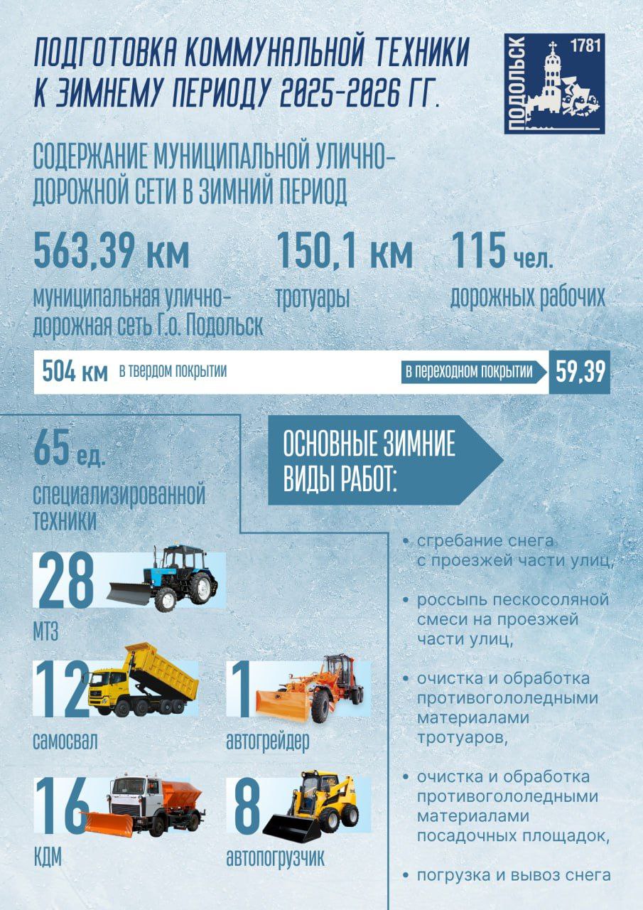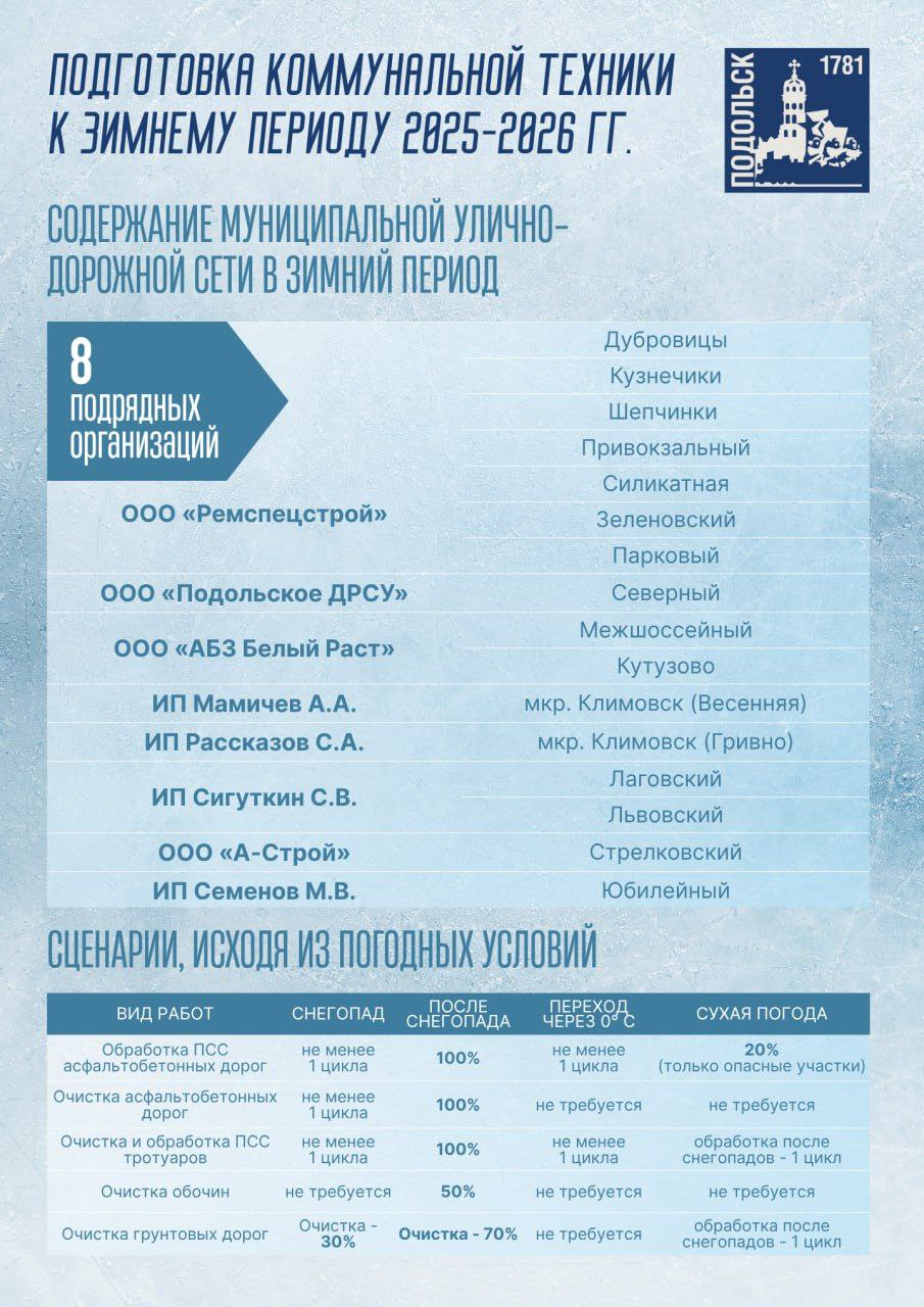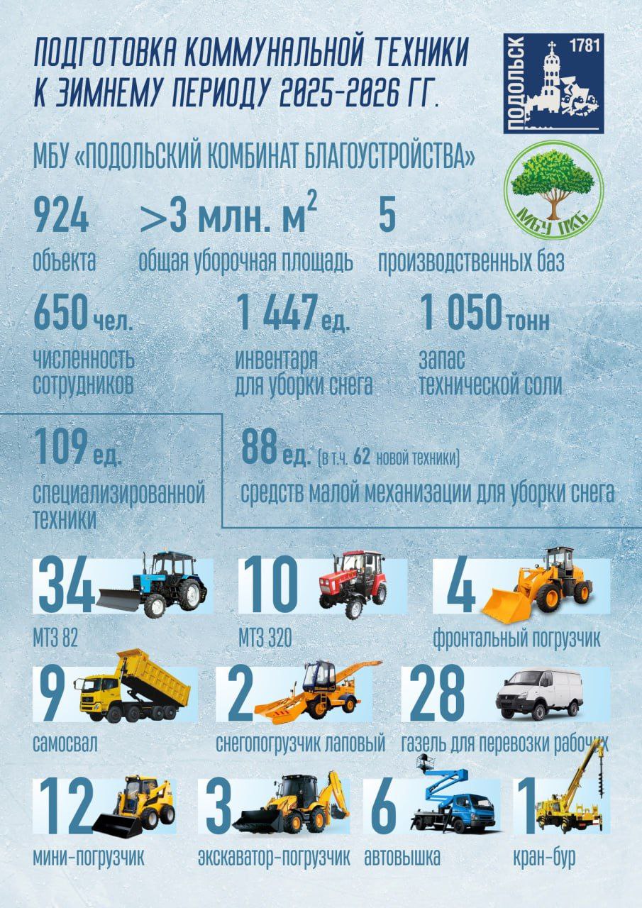 Подольский комбинат благоустройства обеспечит содержание 924 объектов. В работе будет задействовано более 100 единиц техники, 88 единиц малой механизации и свыше 1 400 единиц ручного инвентаря. Создан необходимый запас технической соли. В составе предприятия — 650 сотрудников, работающих на пяти производственных базах, чтобы оперативно реагировать на любые погодные условия.