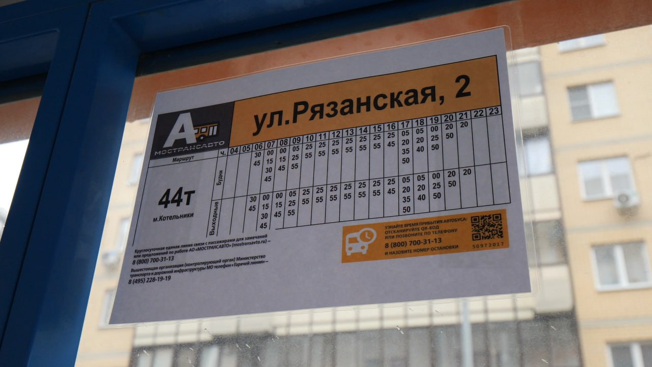 Первый автобус от остановки «ул. Рязанская, 2» отправляется в 6:30, последний — в 21:45 от метро «Котельники». На маршруте действуют льготы на проезд.