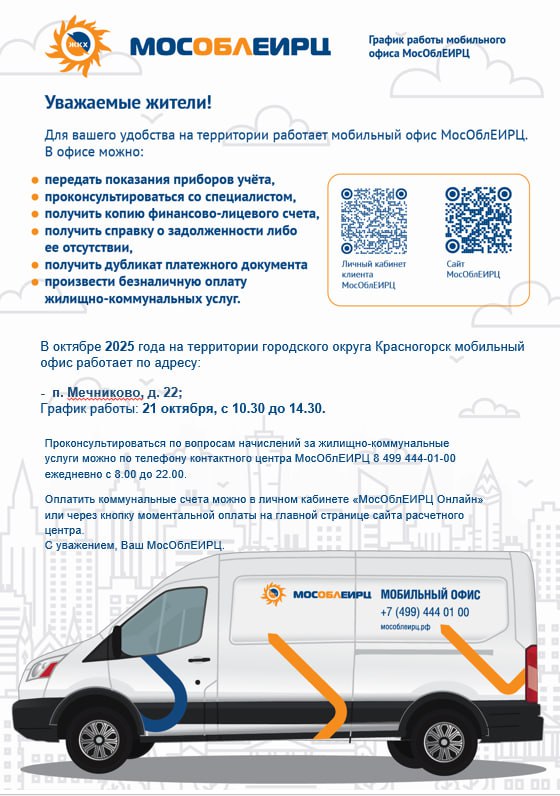 Мобильный офис МосОблЕИРЦ будет работать 21 октября с 10.30 до 14.30 по адресу: п. Мечниково, д. 22.