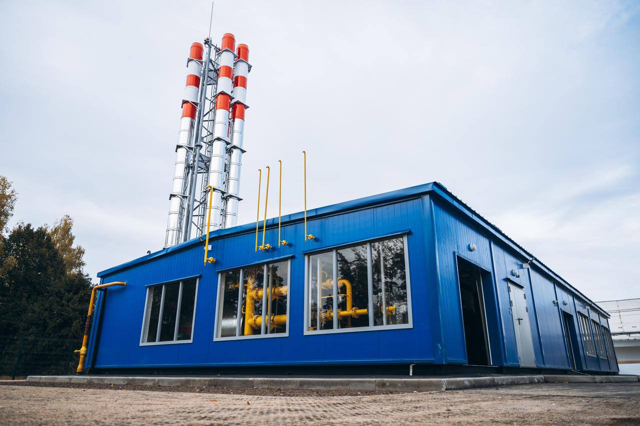 Уже залит фундамент под дымовую трубу, смонтированы блоки котельной и сама труба.
