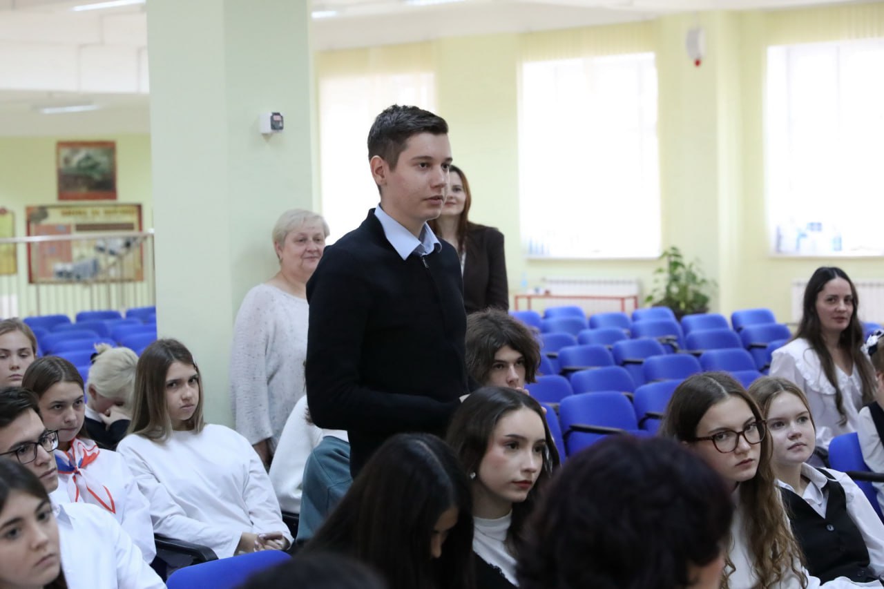 15 октября в школе № 16 прошёл Урок мужества. В свой отпуск на встречу с учащимися, выпускниками и коллегами пришёл Денис Михайлович Колобов. Заместитель директора и по совместительству учитель физики, работавший в школе с момента её основания, в 2022 году добровольцем отправился на СВО. И уже третий год его с нетерпением ждут в школе.
