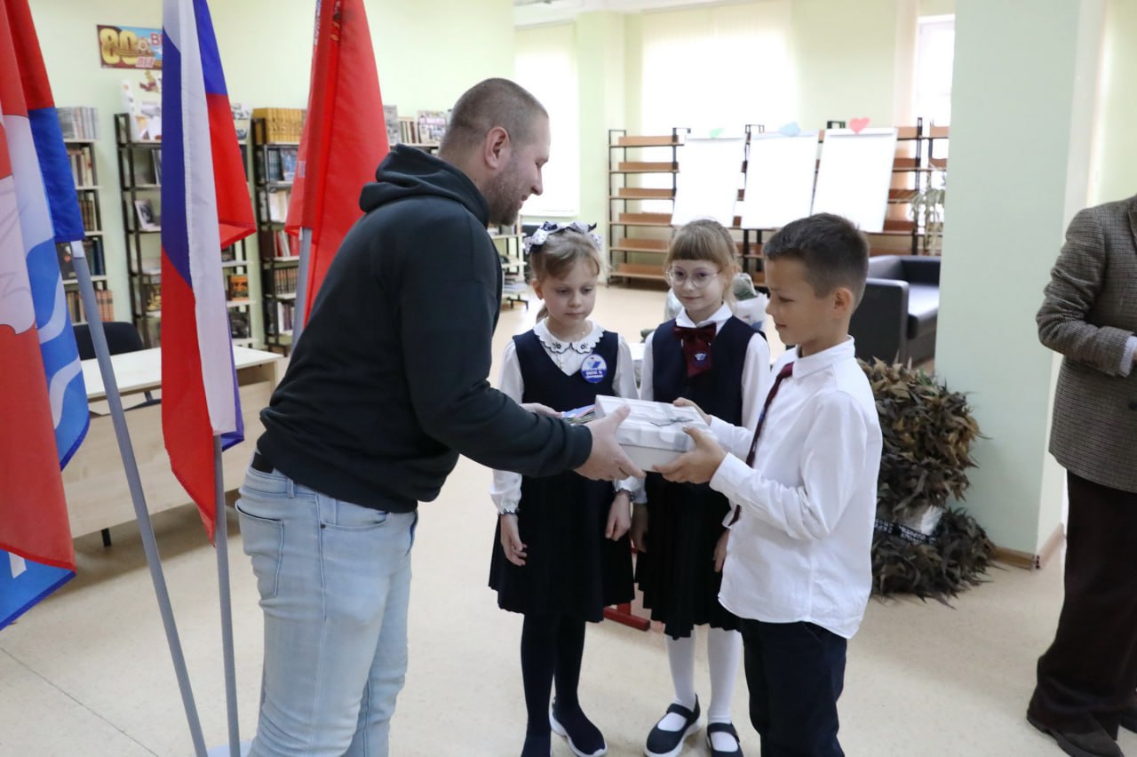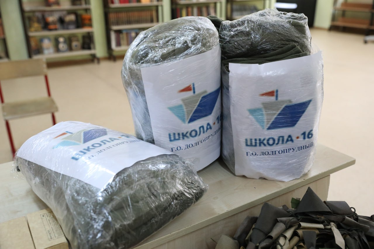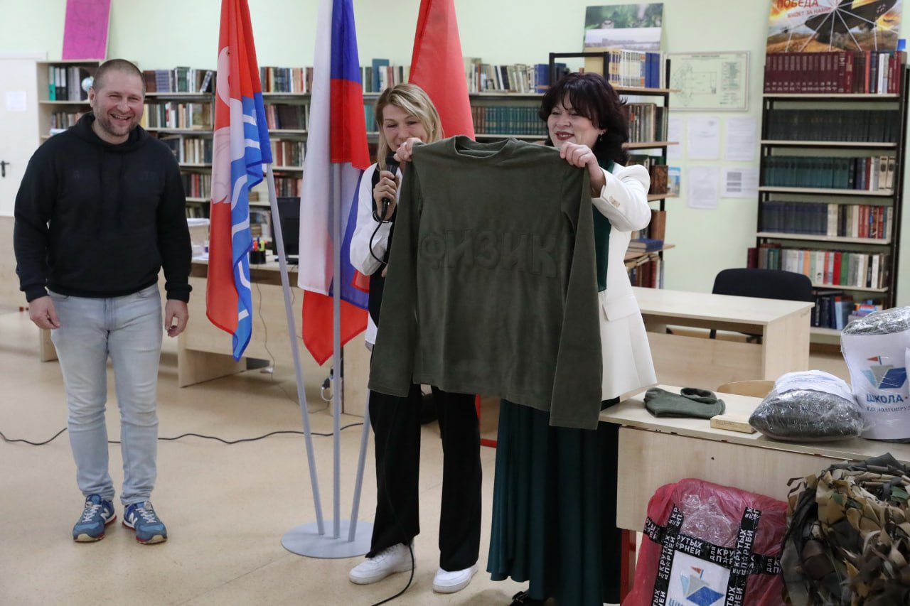 Педагоги, родители и старшеклассники вручили вещи, изготовленные в школе в рамках волонтерского движения: именную термокофту, балаклавы, антитепловизорные одеяла и многое другое.