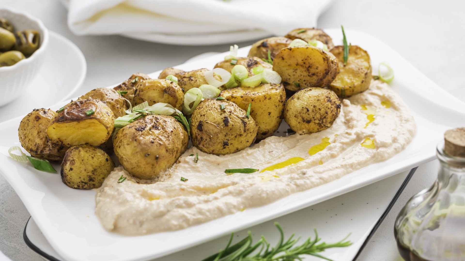 Пока картофель варится, сделайте заправку. Соедините соевый соус, растительное масло, мускатный орех, травы, чеснок и перец. Тщательно перемешайте получившийся состав.