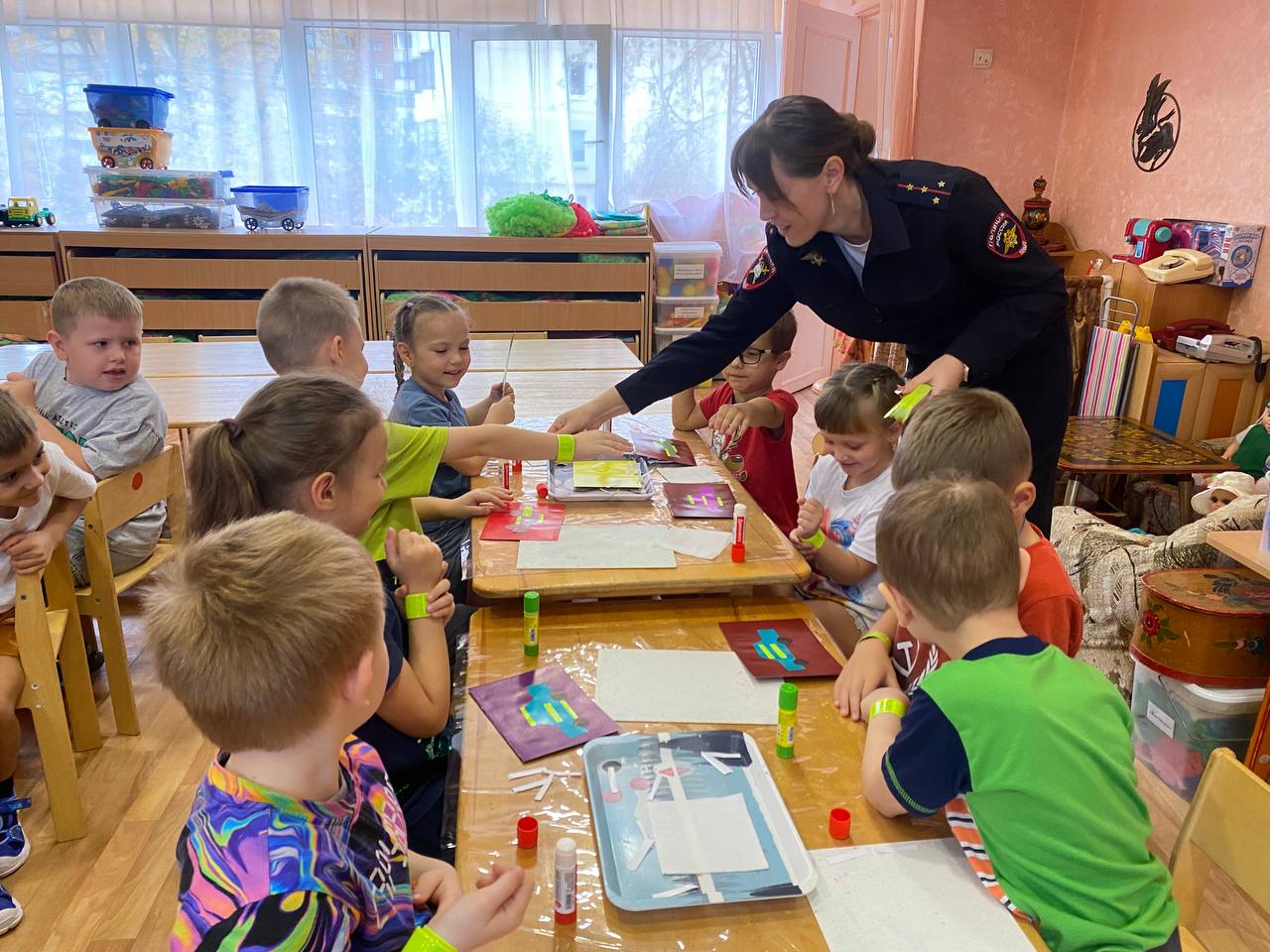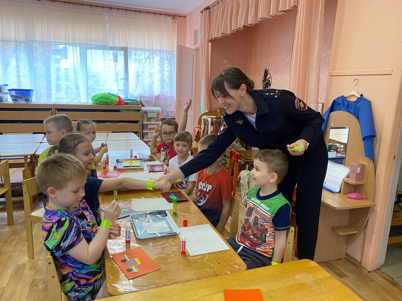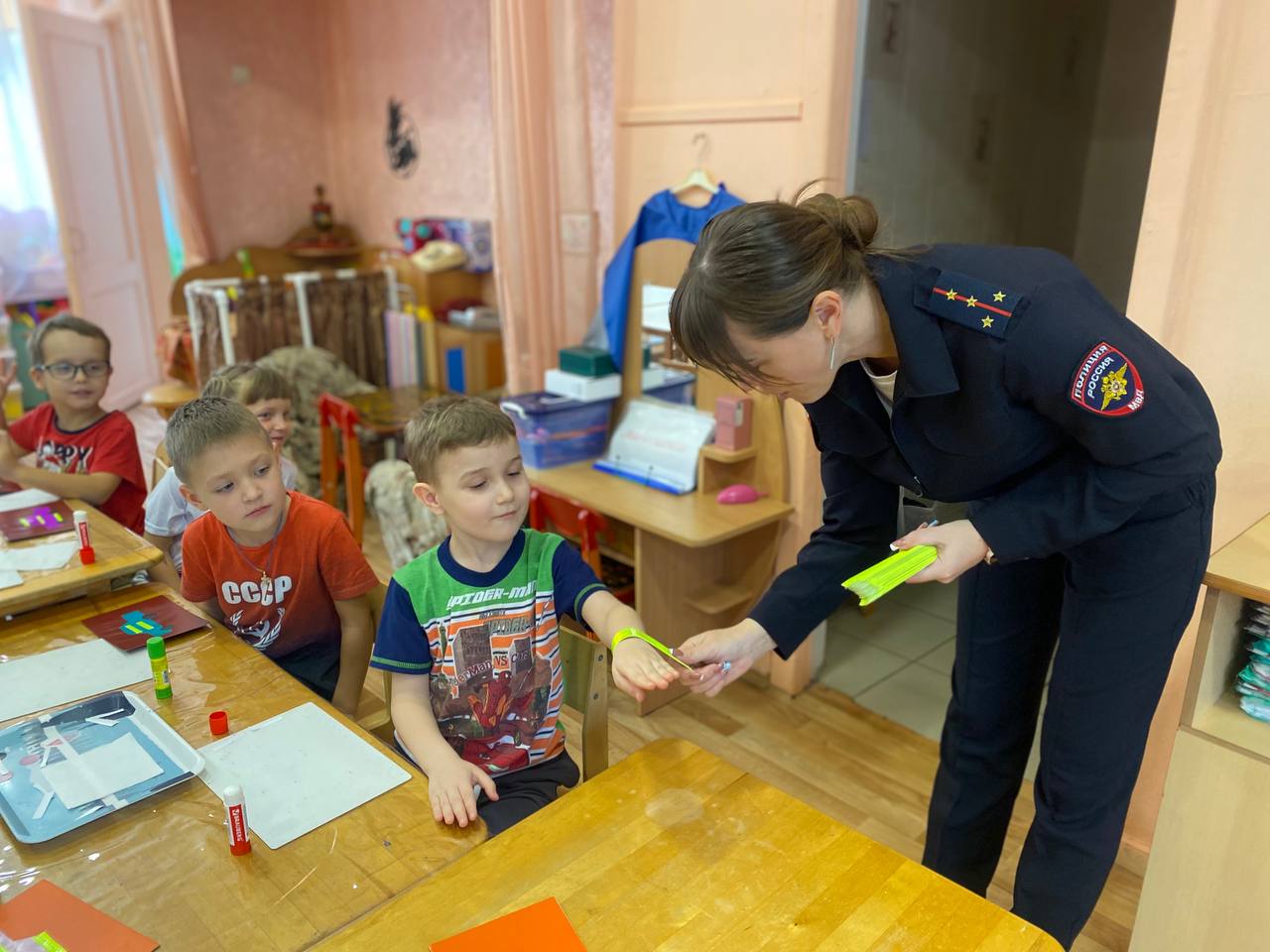 Мероприятия началось с профилактической беседы о важности использования световозвращающих элементов. Затем воспитанники образовательного учреждения под руководством воспитателей и сотрудников отдела Госавтоинспекции изготовили в подарок папам поздравительные открытки и «Светлячки» - наклейки из световозвращающих материалов.