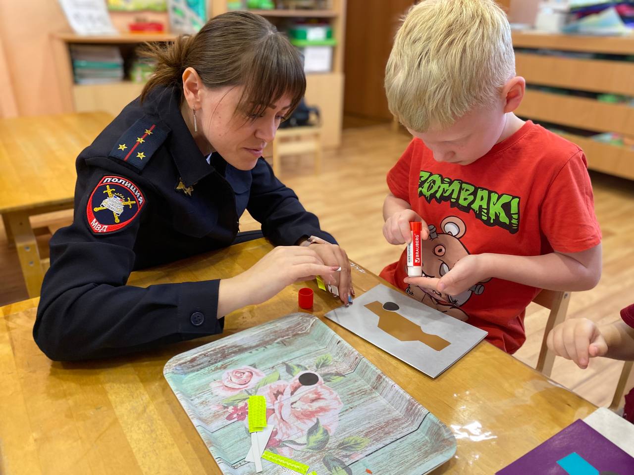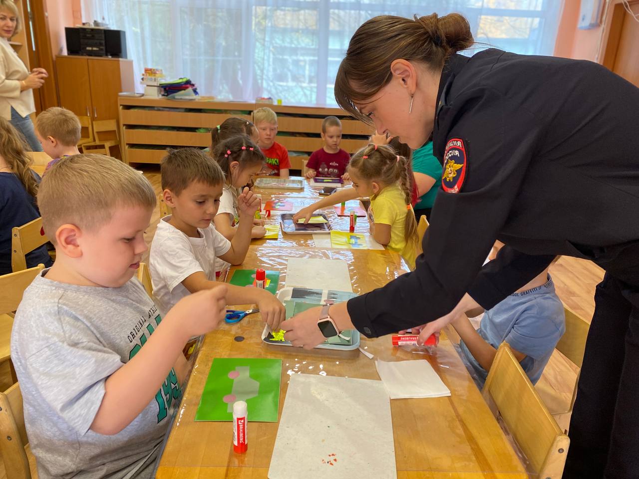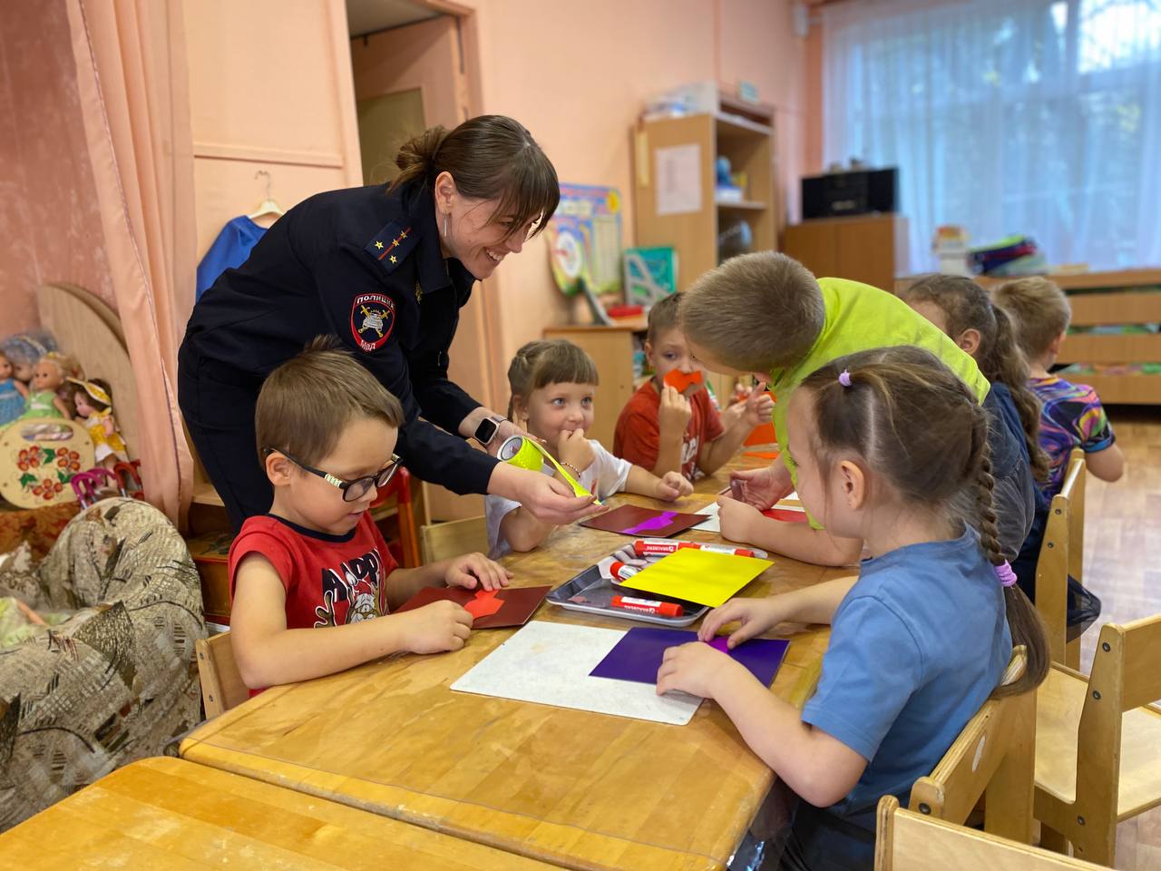 Мероприятия началось с профилактической беседы о важности использования световозвращающих элементов. Затем воспитанники образовательного учреждения под руководством воспитателей и сотрудников отдела Госавтоинспекции изготовили в подарок папам поздравительные открытки и «Светлячки» - наклейки из световозвращающих материалов.