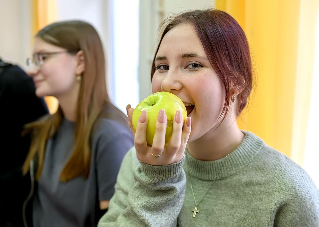 «Я занимаюсь спортом и слежу за своим питанием. Избегаю жирной пищи, сладких газировок. Интересно было узнать, что зелёные яблоки полезнее красных»,