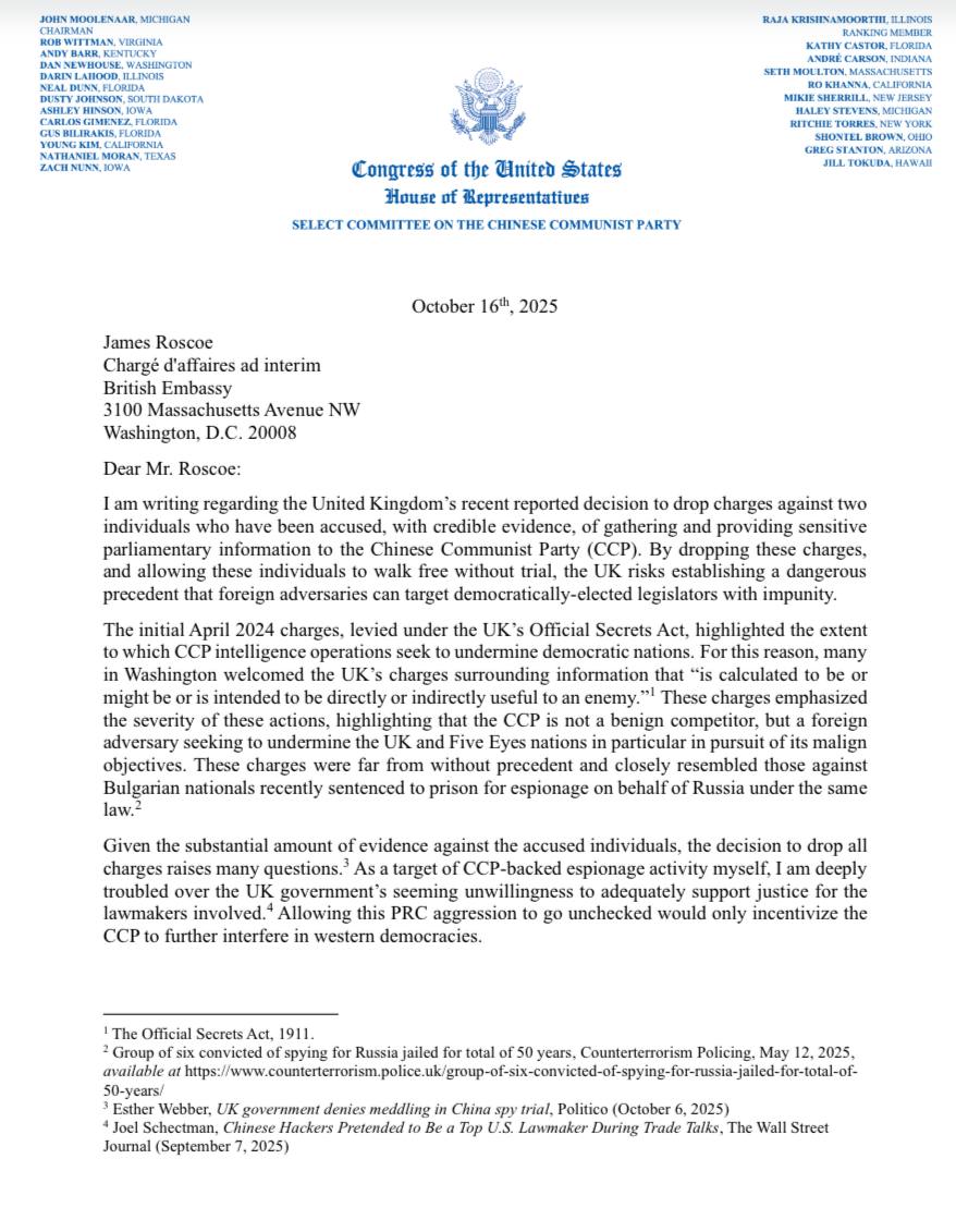 Республиканцы и демократы, написавшие письмо, предупредили, что Великобритания создала опасный прецедент, сняв обвинения с двух предполагаемых шпионов. В письме правительство сэра Кира Стармера обвиняется в том, что оно позволяет китайской агрессии оставаться безнаказанной.