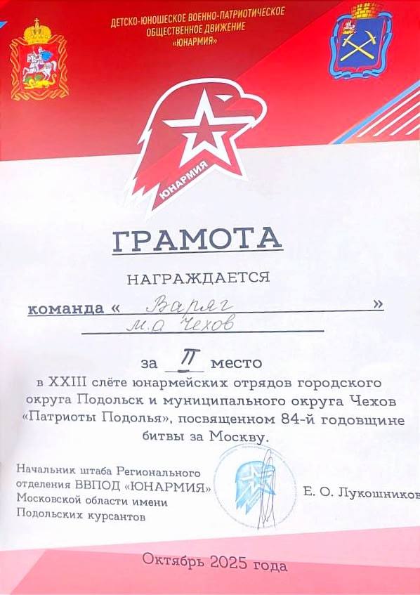 18 октября 2025 года в г. о. Подольск на базе Дома Юнармии прошёл ХХIII открытый слёт юнармейских отрядов г. о. Подольск и м. о. Чехов "Патриоты Подолья", посвящённый 84-ой годовщине битвы за Москву.