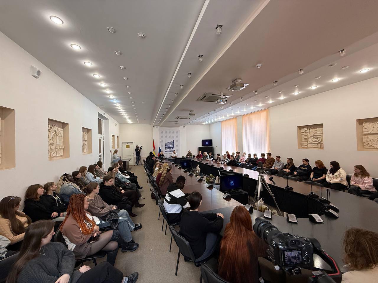 Участники спектакля и член Общественной палаты Московской области, автор-режиссёр проекта, креативный продюсер АНО «Центр креативных индустрий «Новый Город» Михаил Иванов встретились с преподавателями и студентами Курского государственного университета, где провели творческий вечер.