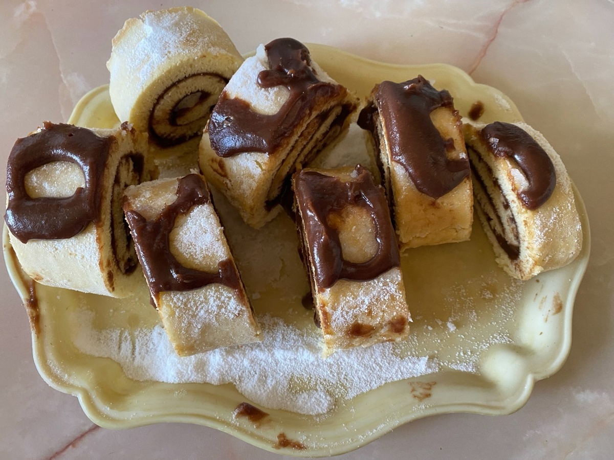 На горячем корже равномерно распределить шоколадную пасту и быстро свернуть рулет. В завершение можно посыпать сверху сахаром-пудрой и насладиться невероятным вкусом свежевыпеченного лакомства.