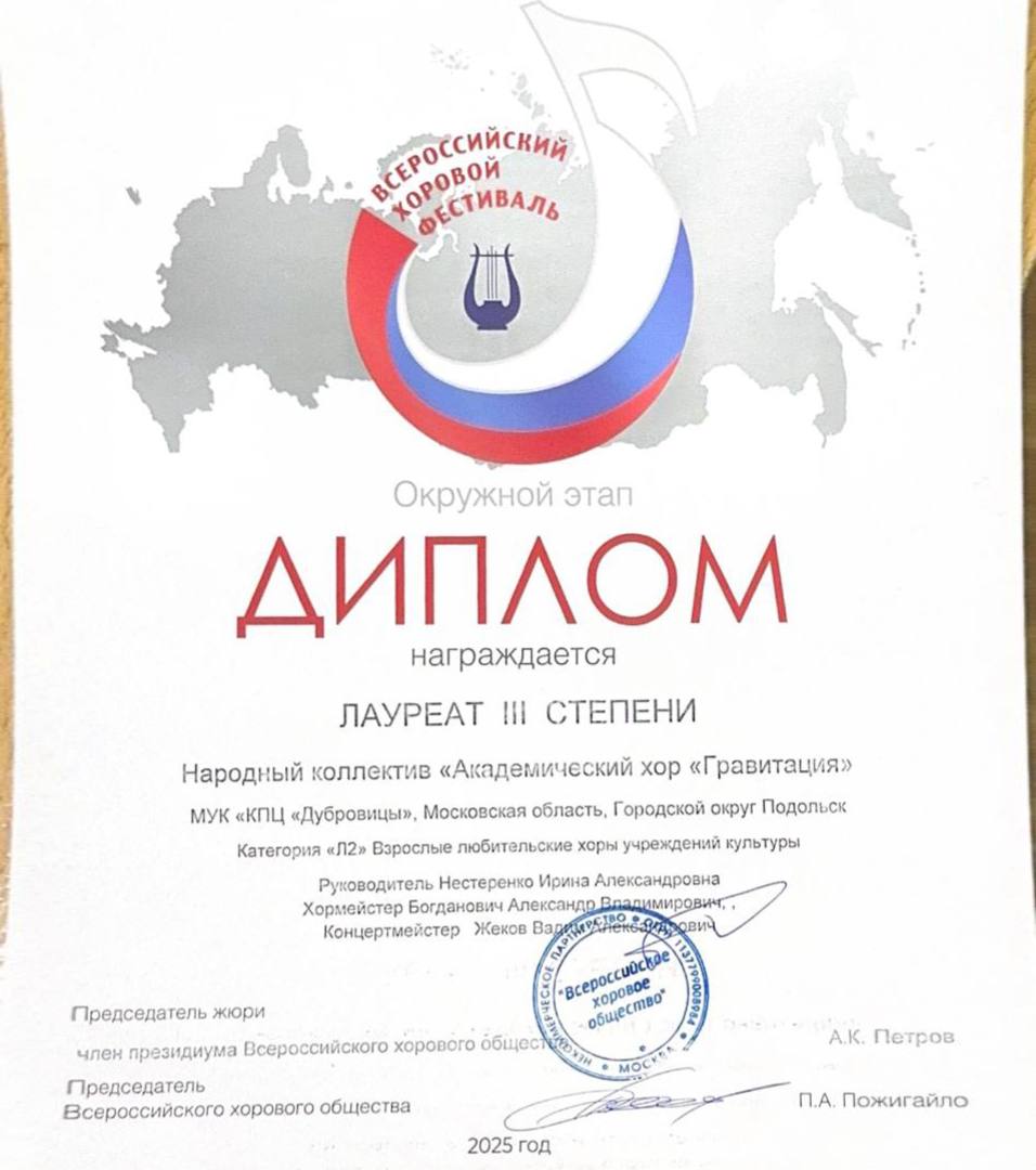Народный коллектив «Академический хор «Гравитация» под руководством Ирины Нестеренко, хормейстера Александра Богдановича и концертмейстера Вадима Жекова получил диплом Лауреата III степени.