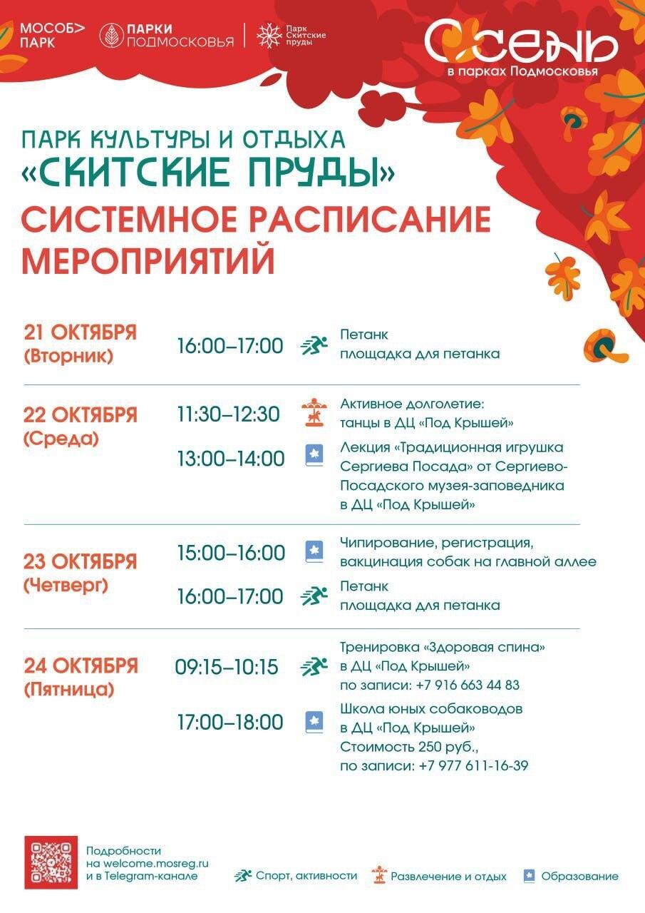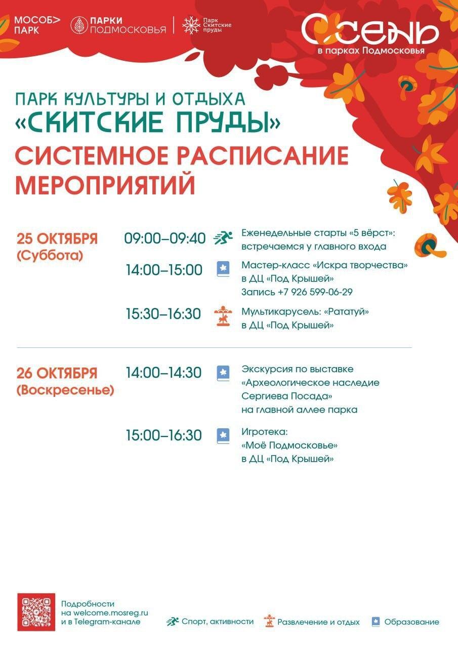 В парке «Скитские пруды» 22 октября состоится лекция «Традиционная игрушка Сергиева Посада» от Сергиево-Посадского музея-заповедника в ДЦ «Под Крышей», а 26 октября всех желающих приглашают на экскурсию по выставке «Археологическое наследие Сергиева Посада»
