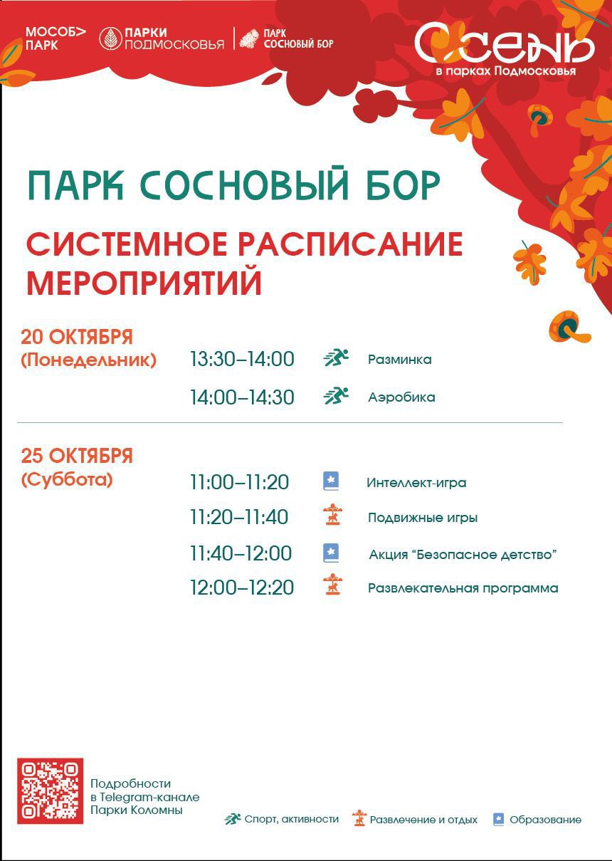 Любителей спорта и приверженцев здорового образа жизни ждут в понедельник в озёрском парке «Сосновый бор» на разминку и урок по аэробике. Коломенский сквер имени В. А. Зайцева в этот же день приглашает поучаствовать в веселых стартах. В парке Мира в Коломне в пятницу пройдет тренировка по футболу, а в субботу – традиционный дружеский забег на дистанцию 5 километров.