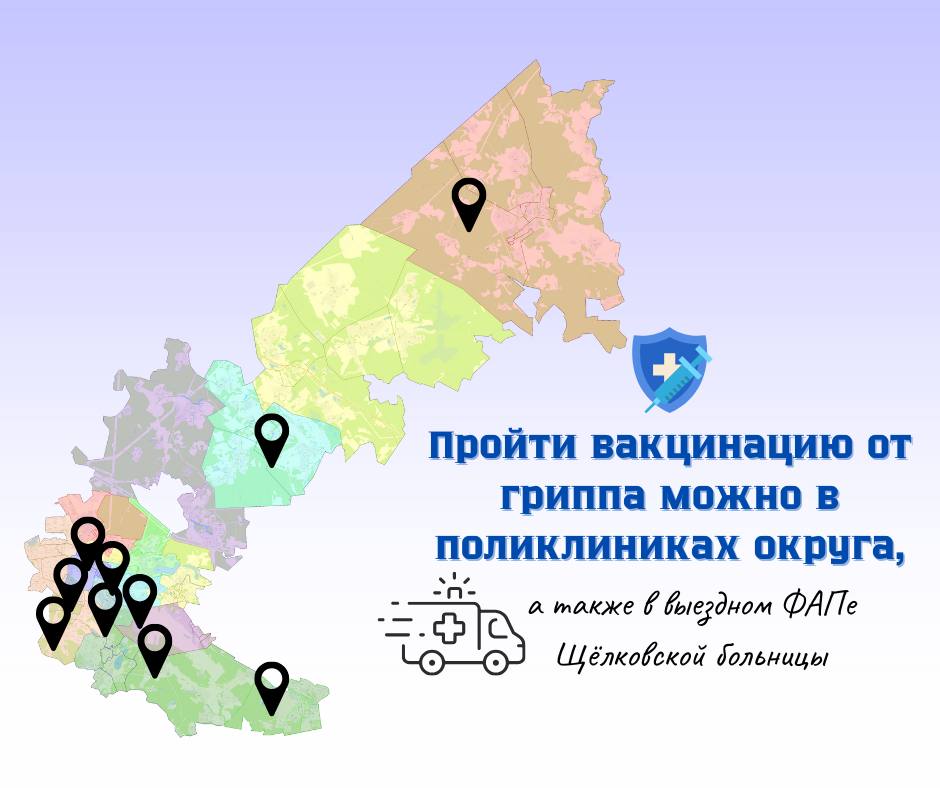 Осень — самое время позаботиться о здоровье. Пройти вакцинацию от гриппа можно в поликлиниках округа, а также в выездном ФАПе Щёлковской больницы* - быстро, бесплатно и без записи.