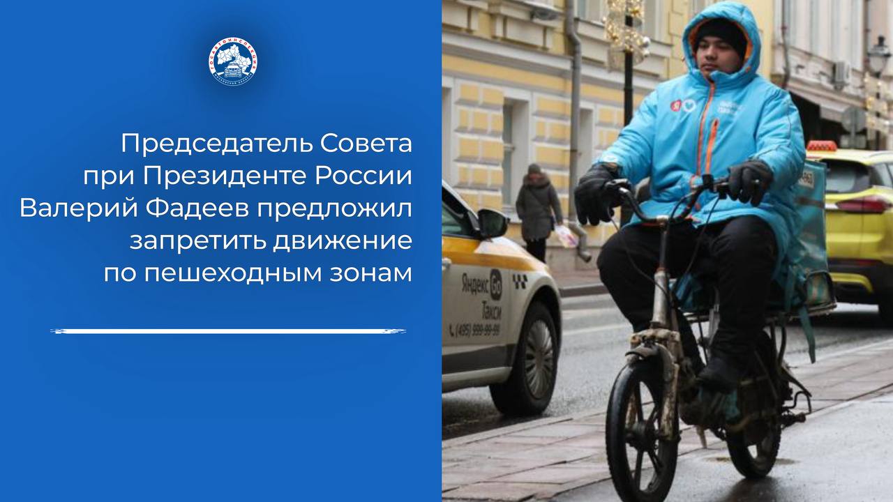 Председатель Совета при Президенте России по развитию гражданского общества и правам человека Валерий Фадеевпредложил запретить движение по пешеходным зонам, тротуарам и велопешеходным дорожкам курьерскому транспорту с сиденьями и электромоторами.