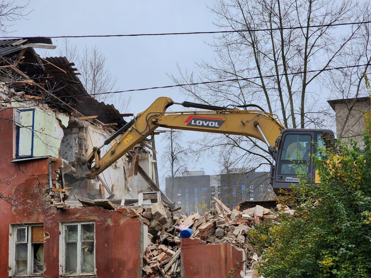 В Старой Купавне на улице Чапаева начали сносить аварийный дом №3. При помощи спецтехники — экскаватора — демонтировали уже половину строения.