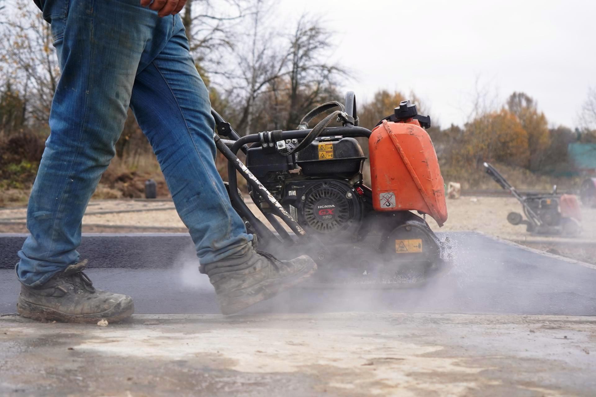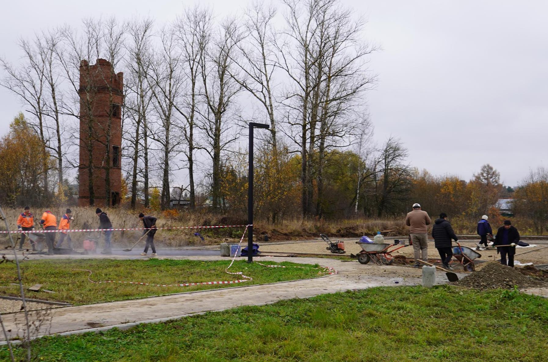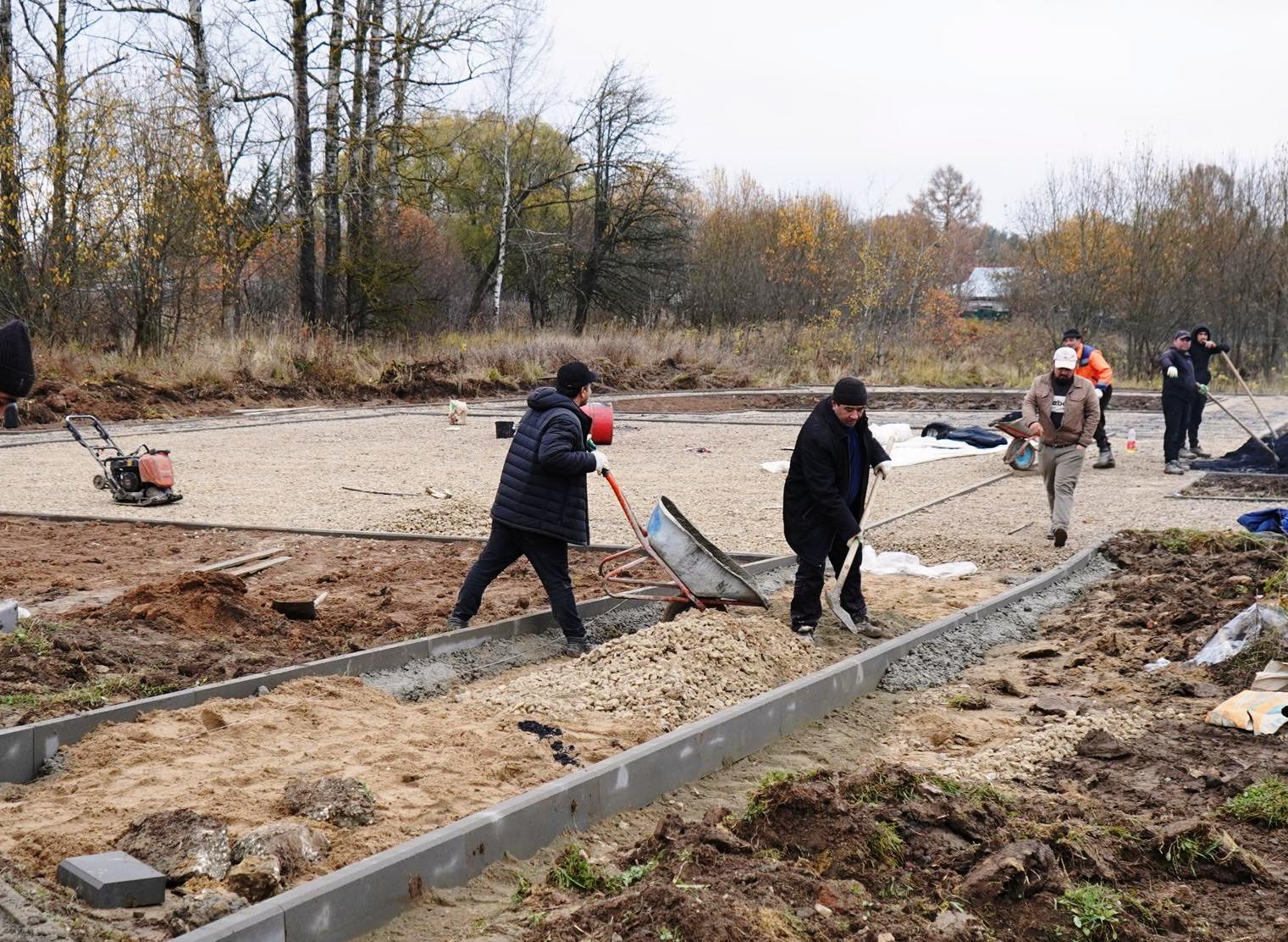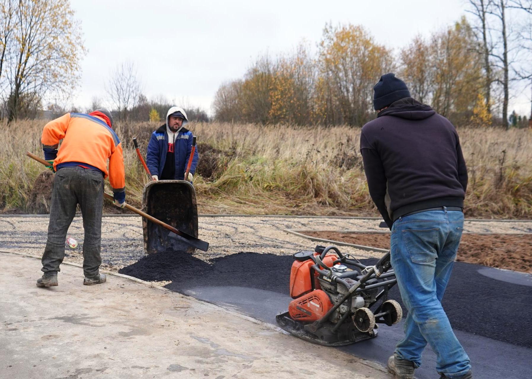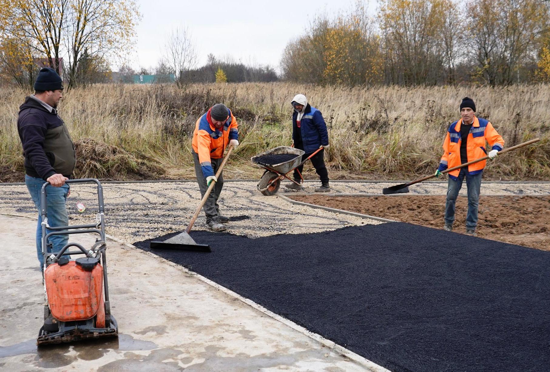 В посёлке Малино на улице Ленина строители завершают асфальтирование площадки для воркаута