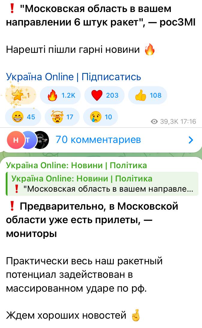 Некоторые каналы сообщают о применении различного вооружения, включая ракеты «Пекло», «Фламинго», Storm Shadow/Scalp, «Нептун», HIMARS, ударные БПЛА, а также неидентифицированные типы ракет. Ситуация развивается, данные уточняются».