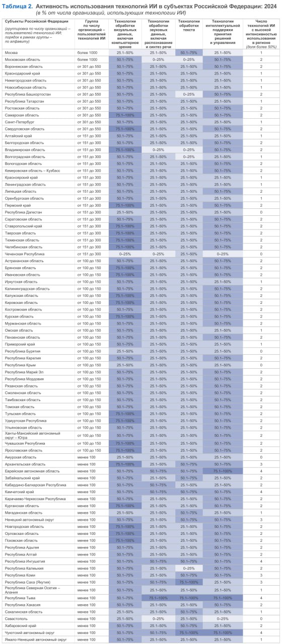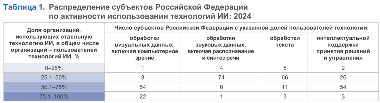 18 субъектов страны сфокусировались на 1 виде ИИ-технологий. Как правило, это компьютерное зрение.