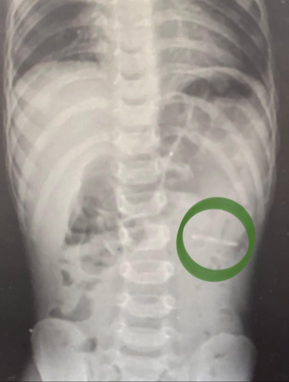 В приемное отделение Раменской больницы родители привезли полуторагодовалого сына, который по неосторожности проглотил крупный ключ от металлической банки. Незамедлительно ребёнку выполнили рентген органов брюшной полости, который показал расположение предмета — он был в желудке.