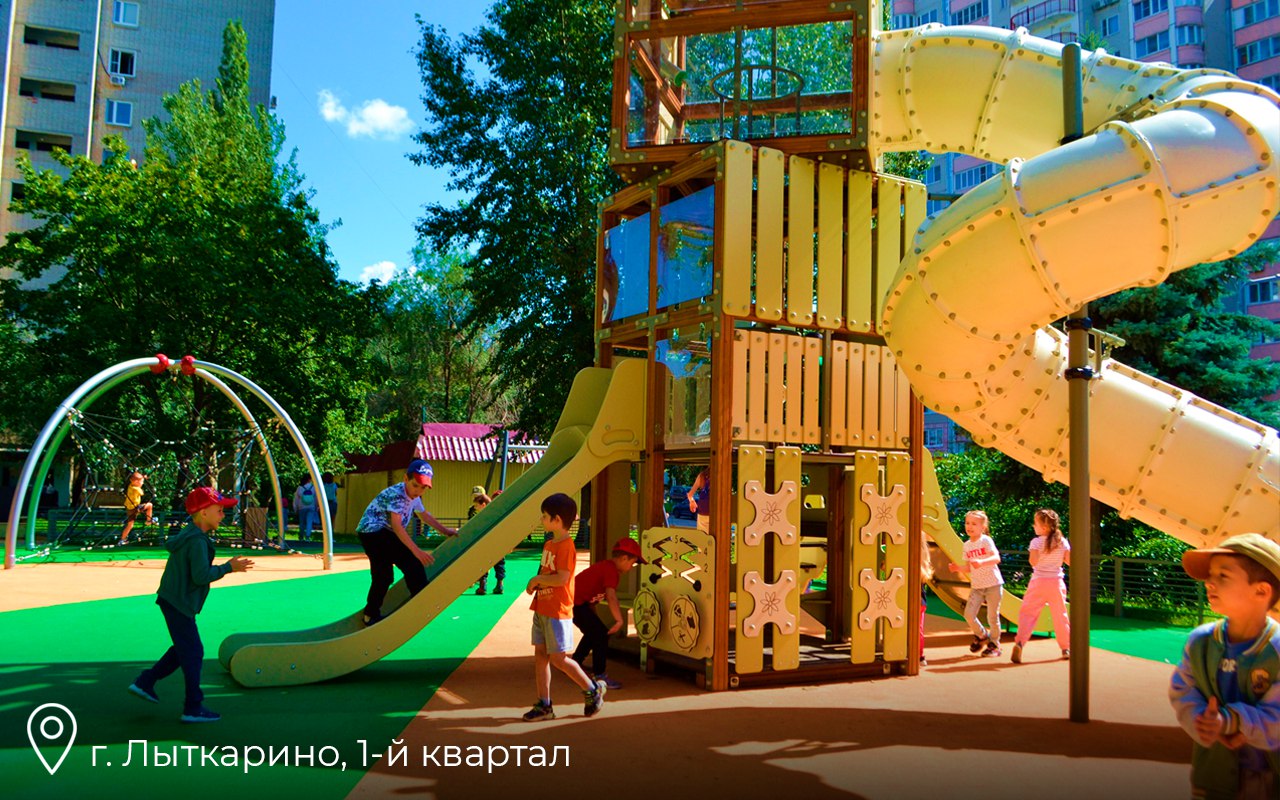 В 1-м квартале в Лыткарине площадка представлена в тематике «Большое приключение». Это целое игровое пространство для активных игр и развития фантазии.