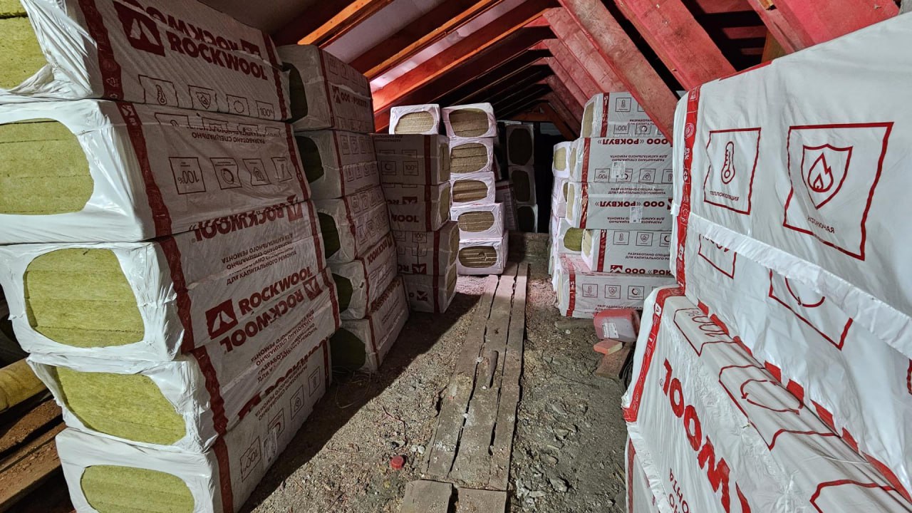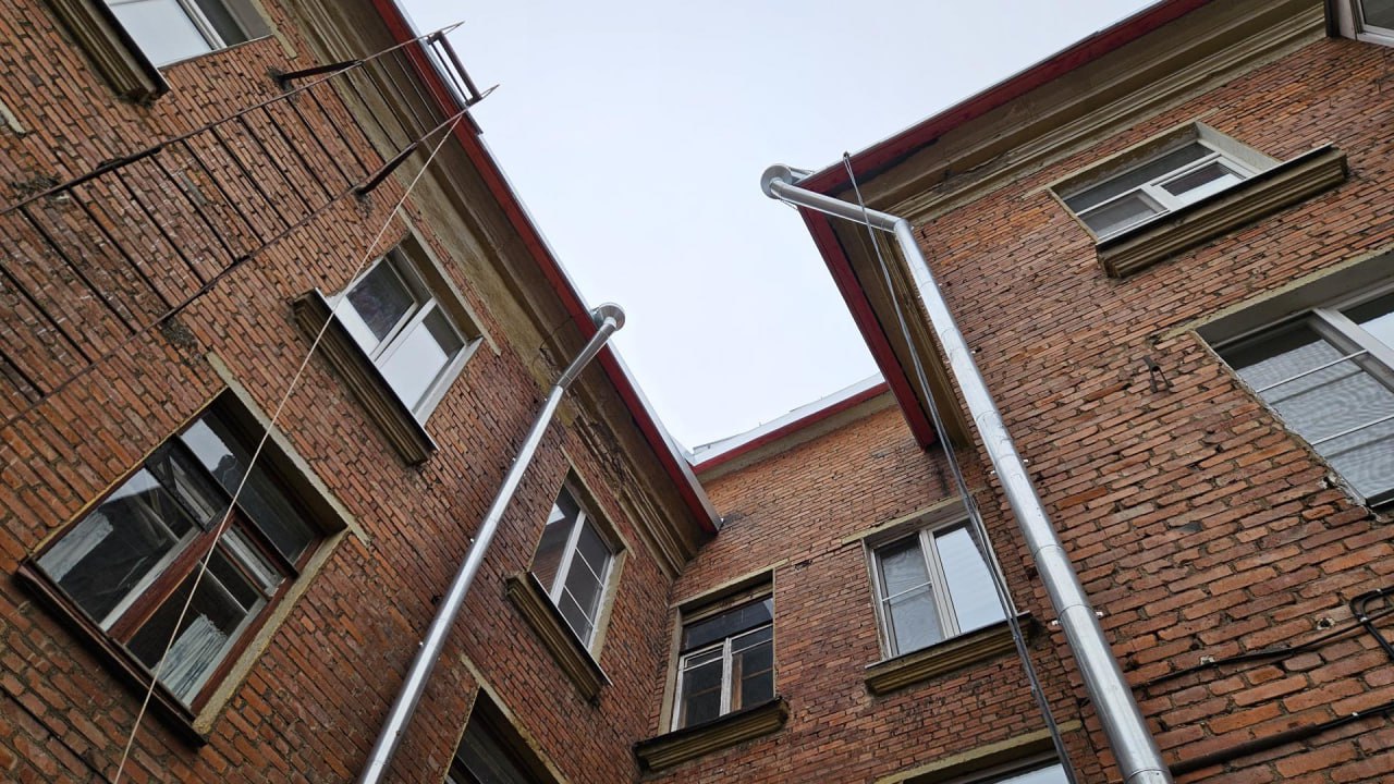 Рабочие заменили стропильную систему и металлическую кровлю. Сейчас идёт демонтаж старых и установка новых водосточных труб. После этого начнётся утепление чердака.