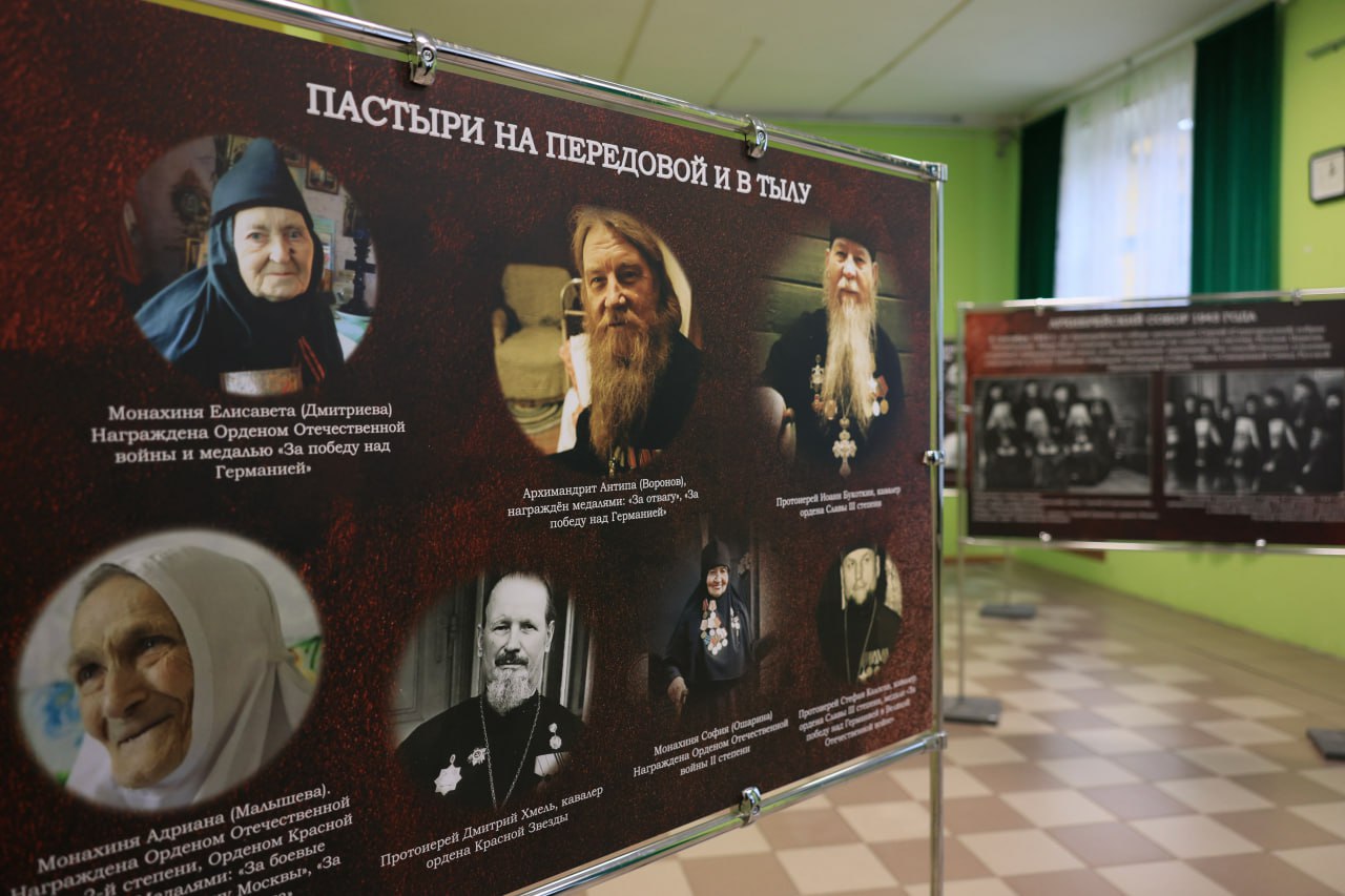 На выставке можно увидеть фотографии протоиерея Михаила Кречетова, который ушел на фронт добровольцем и прошел всю войну, монахини Адрианы, награжденной орденами Отечественной войны 2-й степени и Красной Звезды, медалями «За боевые заслуги», «За оборону Москвы», «За оборону Сталинграда». Монаха Гавриила, который во время войны был фронтовым фотографом и оставил потомкам немало фотографий военных лет, награжден орденом Отечественной войны II степени, медалями «За боевые заслуги» и «За оборону Москвы».
