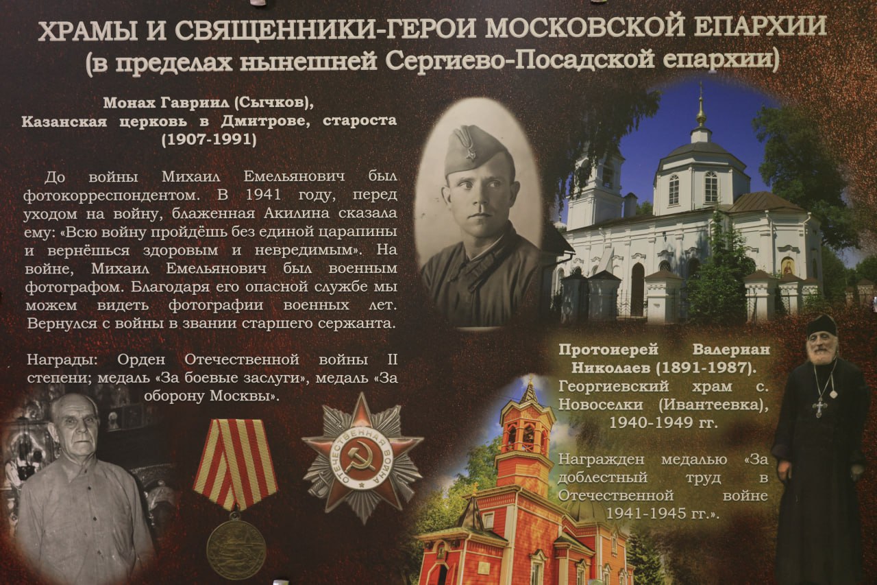 Сергиево-Посадская епархия дала немало героев, отстоявших свободу Родины. В их числе – священники, монахи и монахини сражавшиеся на передовой, и те, кто ковал победу в тылу. Центр епархии – Троице-Сергиева Лавра в 1941 году превратилась в мощный оборонительный рубеж. Монахи и местные жители расчищали древние бойницы, приспосабливали крепостные стены для ведения огня, маскировали купола храмов – Троицкий собор закрыли холстом, другие главы закрасили темной краской. С высоты Лаврской колокольни велось круглосуточное наблюдение за вражескими самолетами, а в монастырских стенах организовали военный госпиталь.