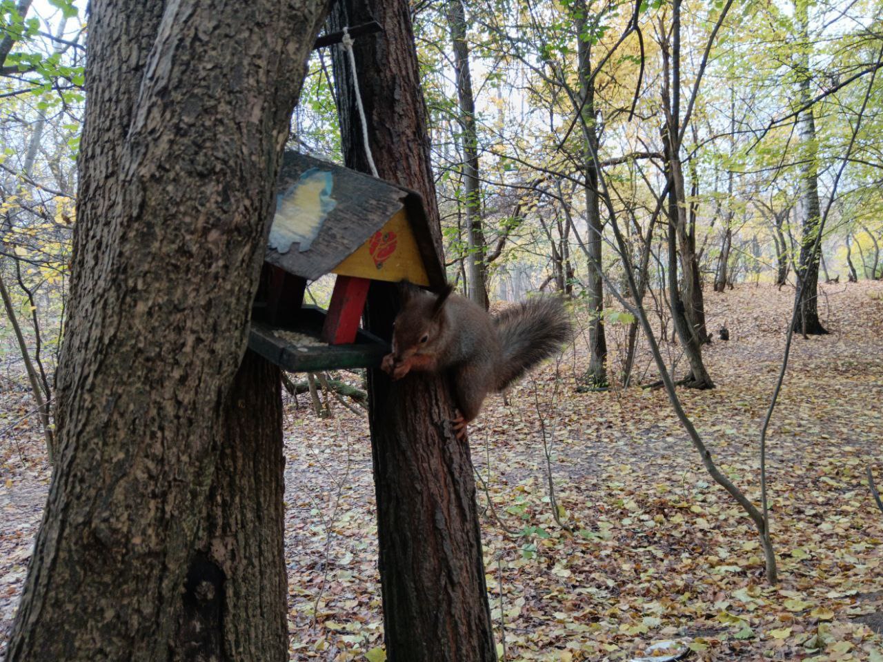 Но пока пугливые птахи с высоты присматривались к новинкам, приёмку кормушек провели белки. Они тут же одобрили угощение, деревянные домики и, кажется, остались очень довольны!