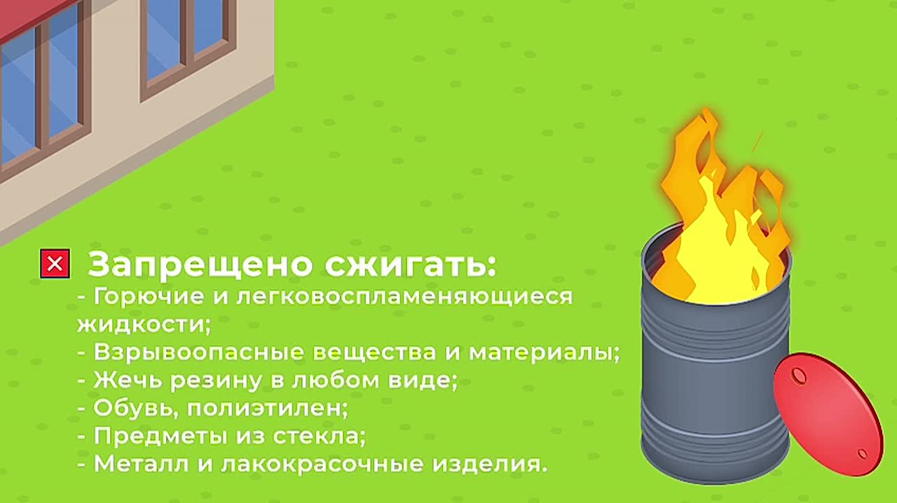В видео рассказано, какие отходы можно сжечь, а какие – нет. Также напомнили про средства пожаротушения.