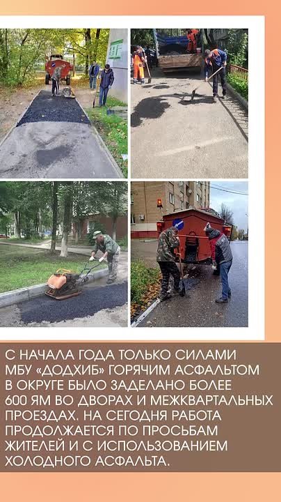 С начала года только силами МБУ «ДОДХИБ» горячим асфальтом в округе было заделано более 600 ям во дворах и межквартальных проездах. На сегодня работа продолжается по просьбам жителей и с использованием холодного асфальта.
