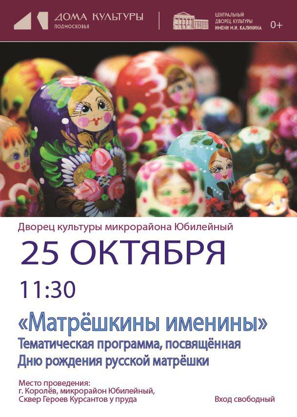 Приглашаем вас 25 октября в Сквере Героев Курсантов у пруда мкр Юбилейный, где пройдет тематическая программа «Матрёшкины именины», посвящённая Дню рождения русской матрёшки.
