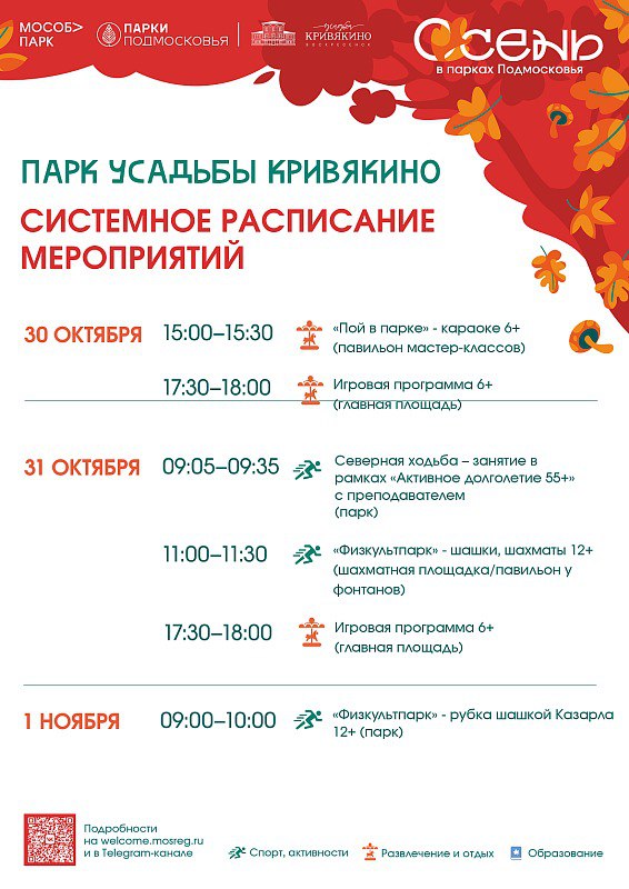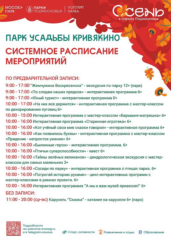 Парки Воскресенска приглашают гостей и жителей округа на свои мероприятия, которые пройдут с 27 октября по 2 ноября 2025 года.