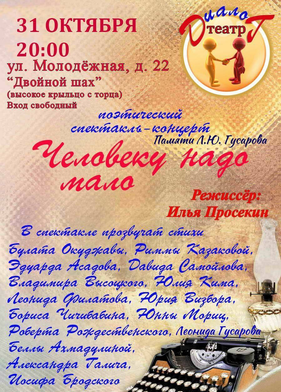 Театр-студия «Диалог» открывает свой восьмой театральный сезон. В центре новой программы — спектакль «Человеку надо мало», представляющий собой художественное осмысление эпохи «оттепели» сквозь призму современного восприятия.